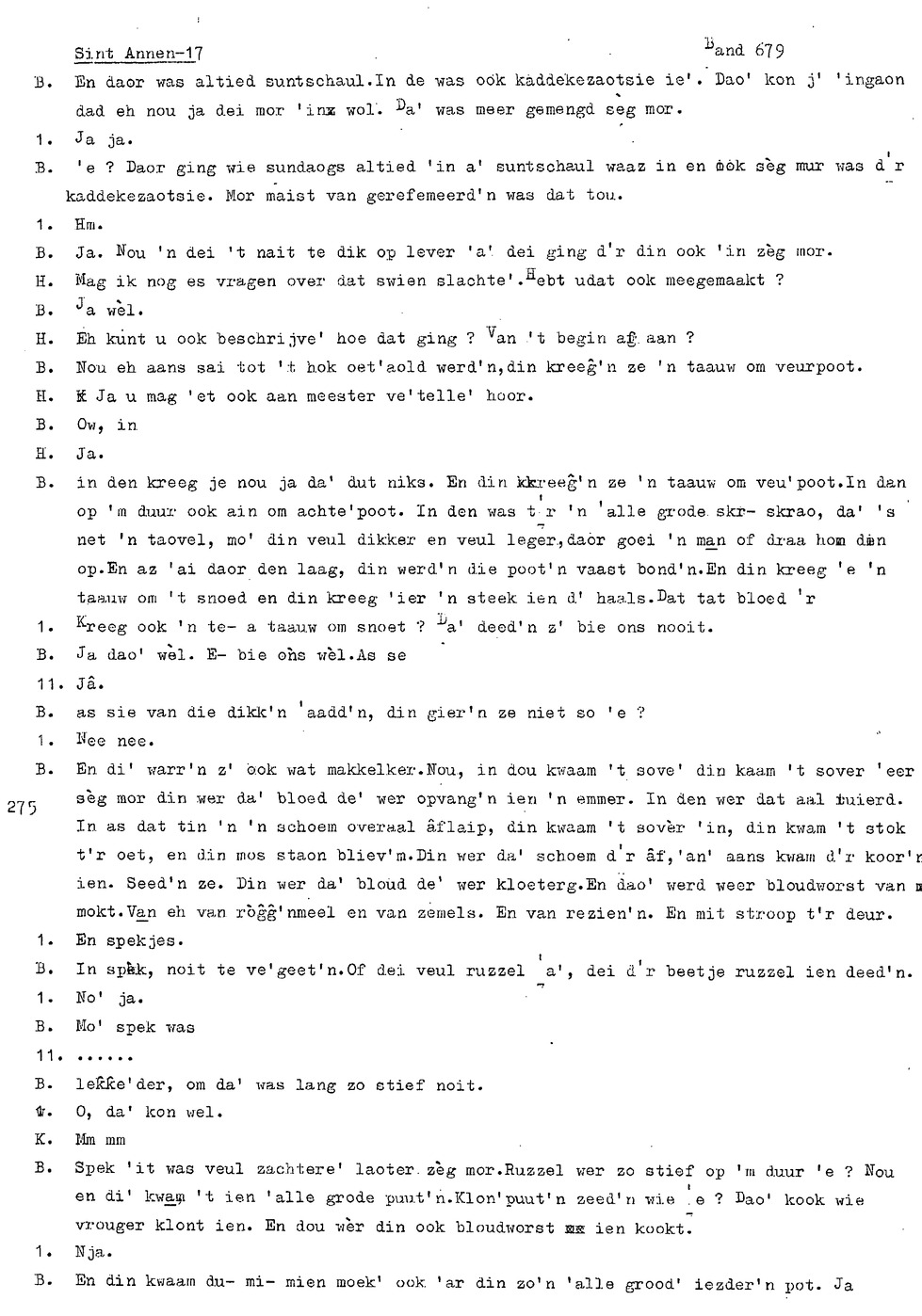 verslag van wat er bij slachten gebeurde; ‘ schenken niet bij de ‘wiem' , maar bij de bakker te drogen hangen, alles in goeien zakken dat er ‘ goin leev'm bie koom'm kon' ; ‘ Thuis ging het vlees in een kist met ‘ boonstroe en kaalk'