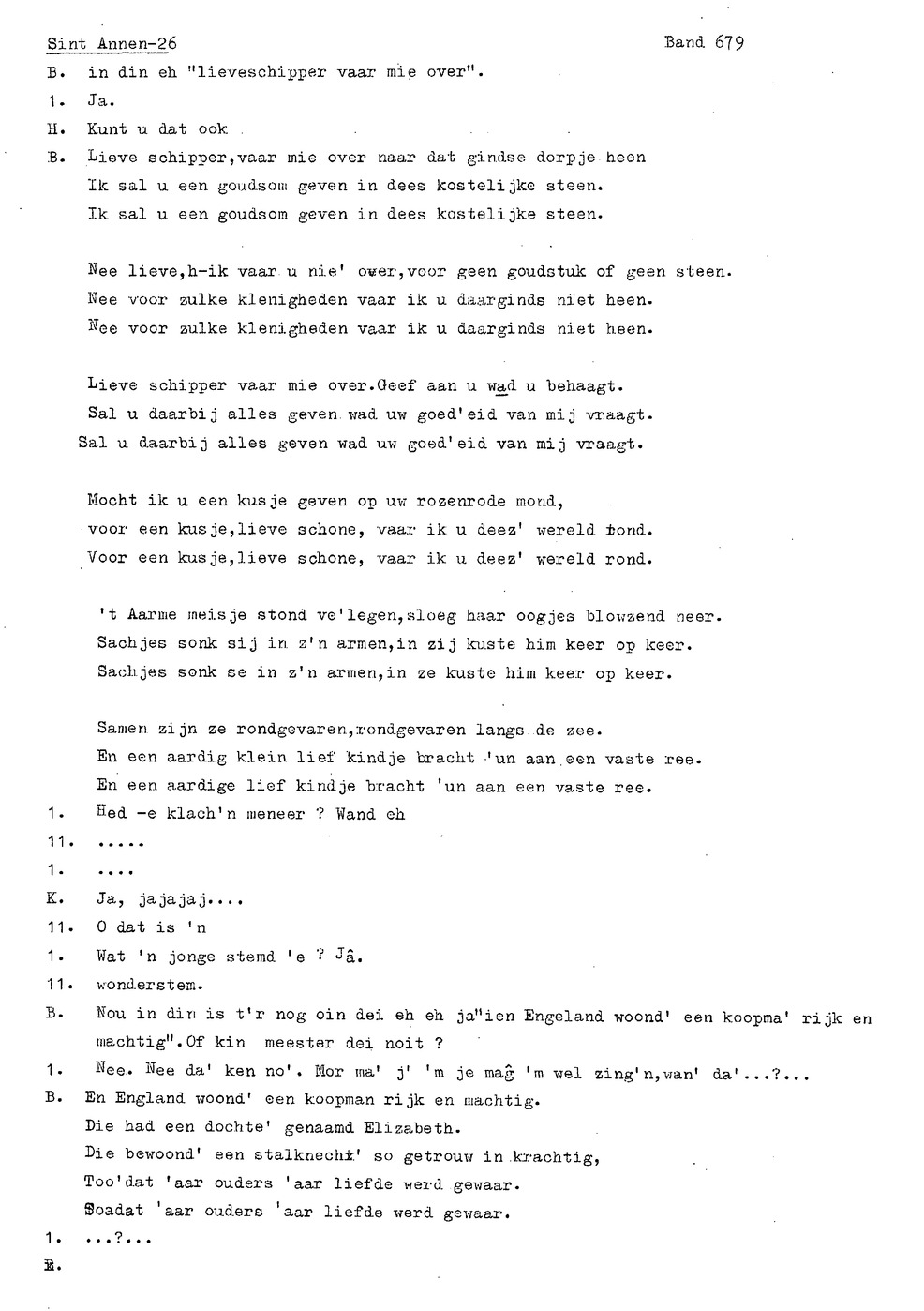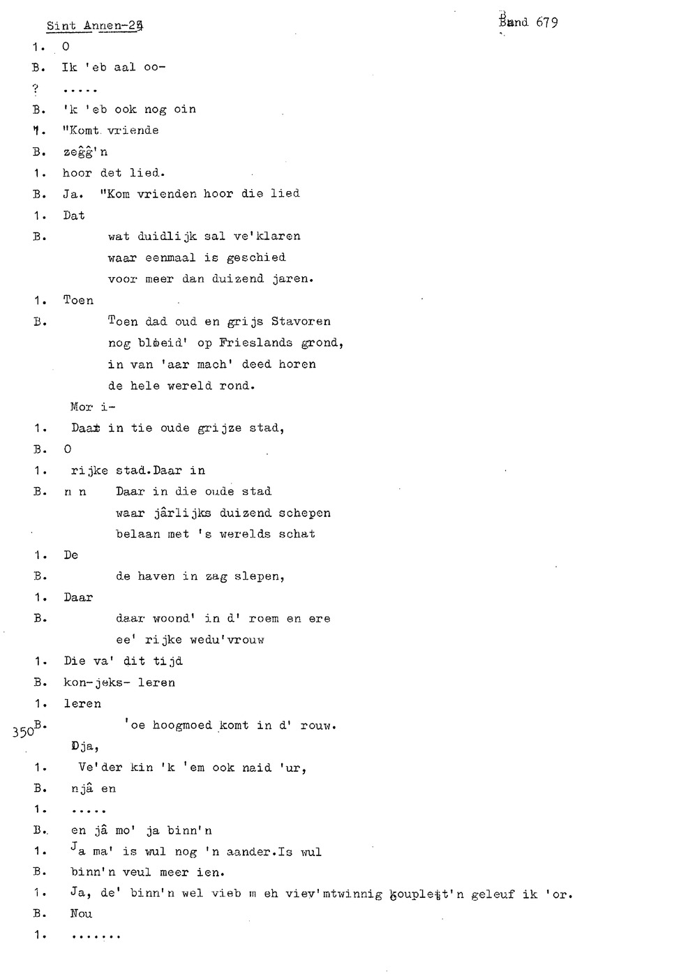 ‘over het vrouwtje Van Stavoren' ; ‘ Lieve schipper vaar mie over' en ‘ Ien England woond' een koopman rijk en machtig; ‘k Zal d'r van dezen avond nog eens uit vrijen gaan' ; en ‘ mien vaoderzee lest tegen mie.