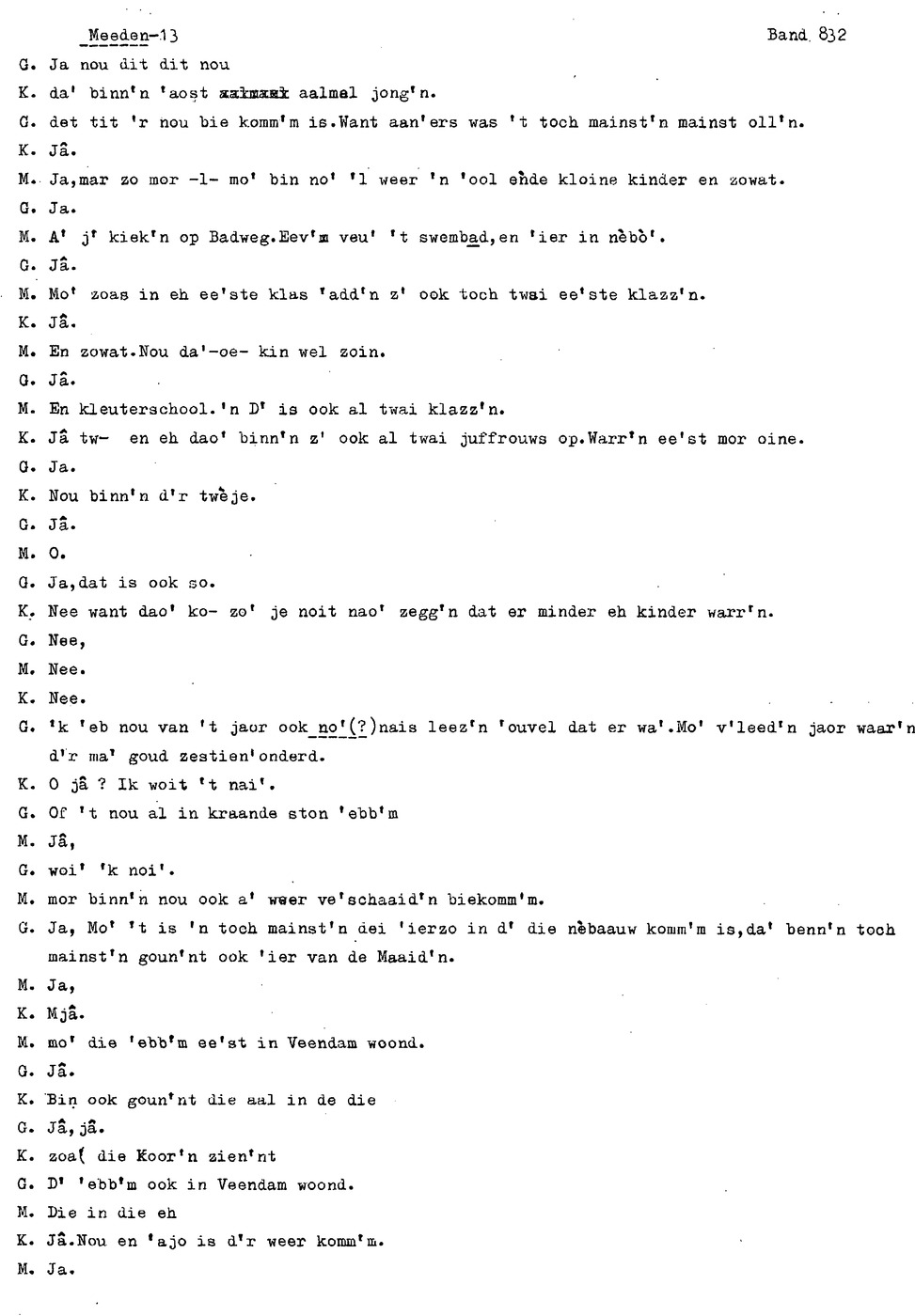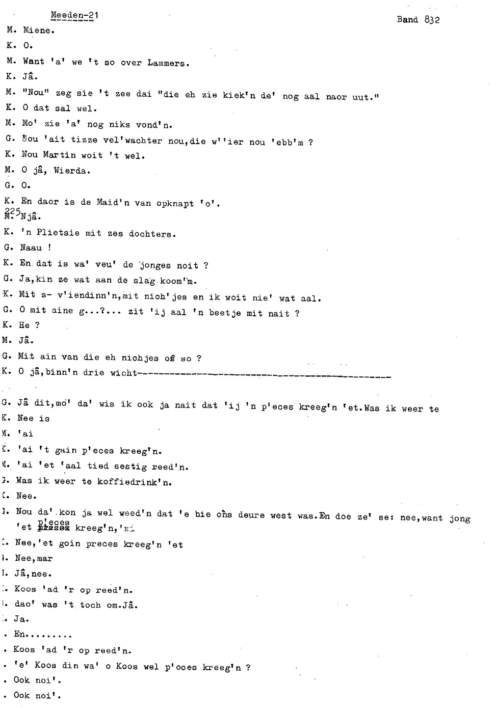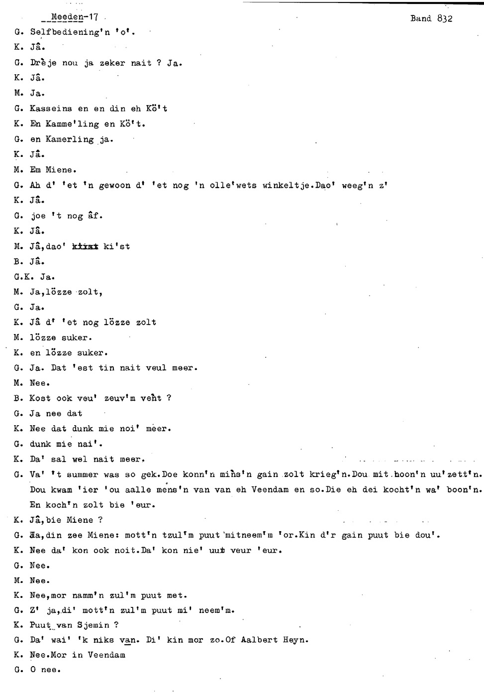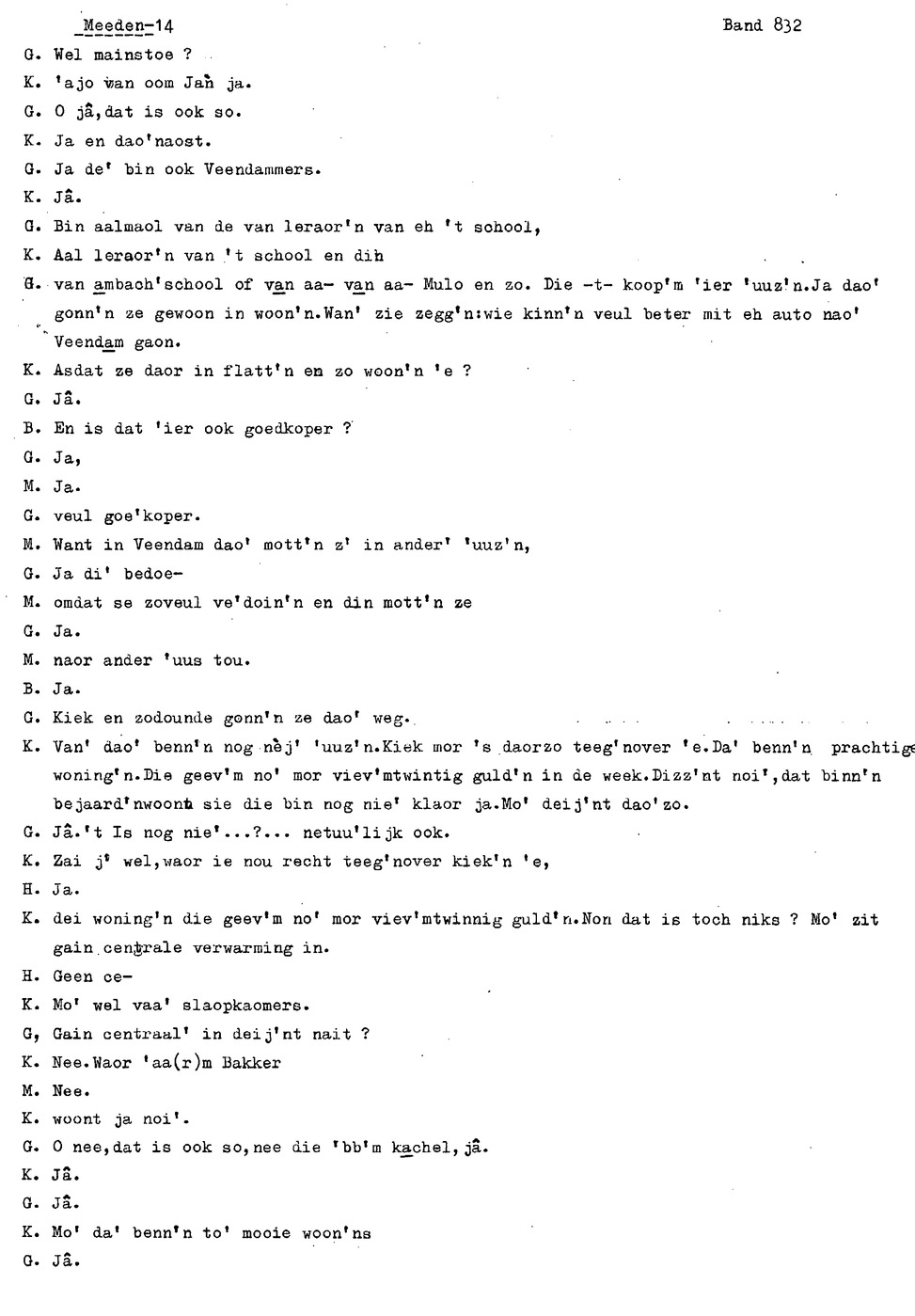 onderwerp: Over toneelspelen.; Over ziekte en ongevallen man spr. 1.; Over plaatsgenoten en kwalen.; Over huis en inrichting, schoonamekn spr. 2 en 3; Over grijze haren, haren verven; Over de plaats Meden: (de importbevolking, velen hebben in Meeden een weekendhuisje, jongelui trekken weg, de scholen, bevolkingsaantal, de nieuwbouw, de winkels, inkpen doen soms in Veendam, Winschoten en Stad; Over oude vrouw met klein winkeltje en caf'e, diefstal bij haar.; Over televisie kijken bij anderen; 370-eind: woorden naar twee tekeningen