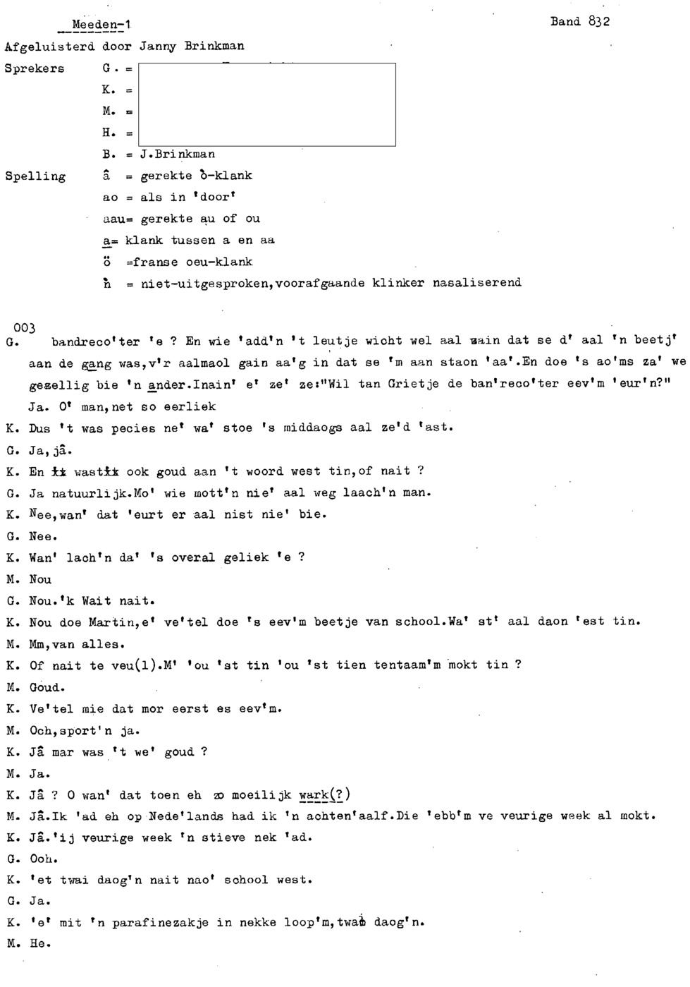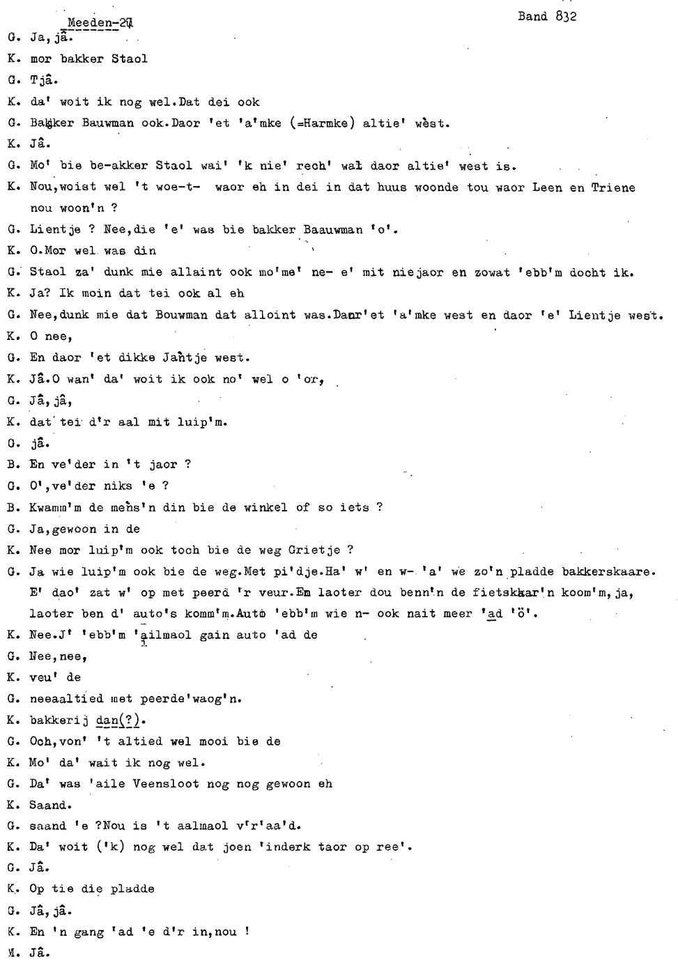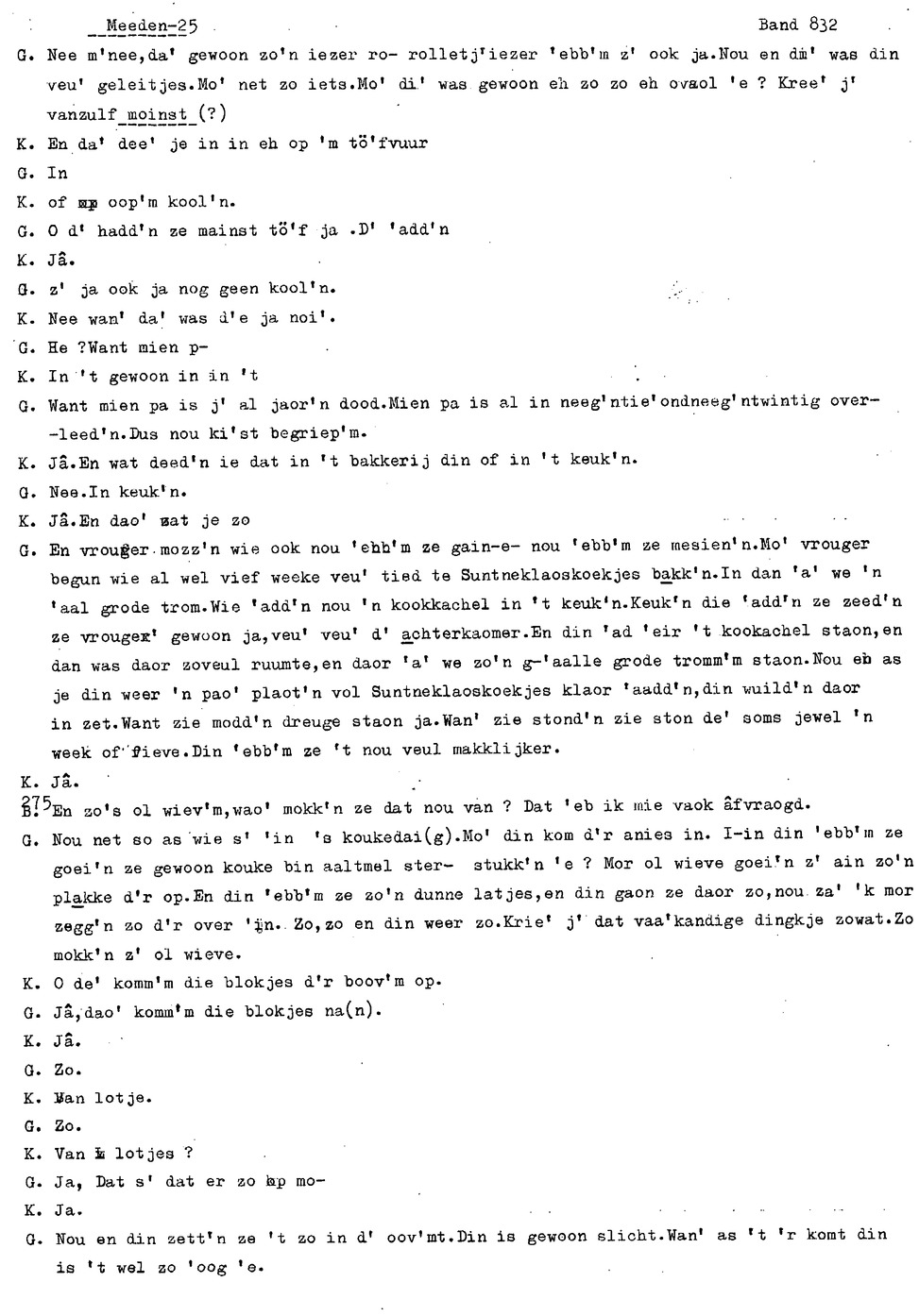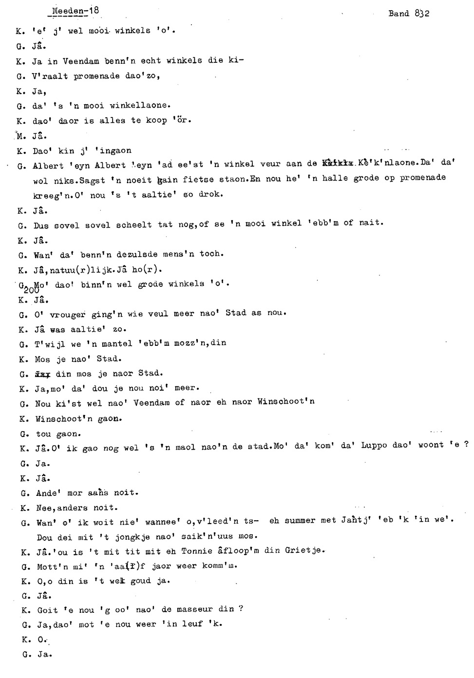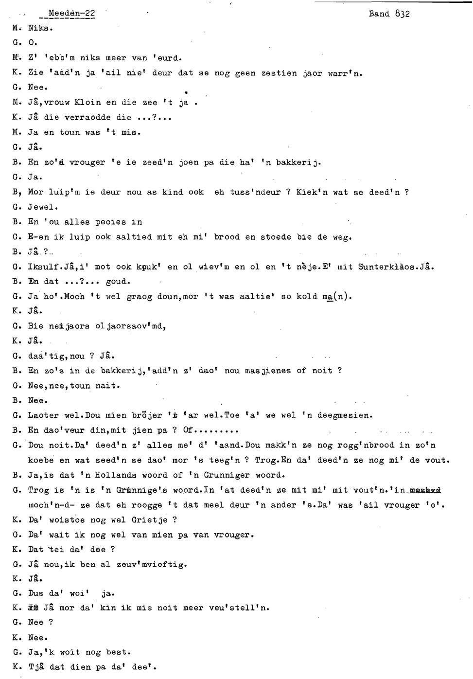 onderwerp: Over toneelspelen.; Over ziekte en ongevallen man spr. 1.; Over plaatsgenoten en kwalen.; Over huis en inrichting, schoonamekn spr. 2 en 3; Over grijze haren, haren verven; Over de plaats Meden: (de importbevolking, velen hebben in Meeden een weekendhuisje, jongelui trekken weg, de scholen, bevolkingsaantal, de nieuwbouw, de winkels, inkpen doen soms in Veendam, Winschoten en Stad; Over oude vrouw met klein winkeltje en caf'e, diefstal bij haar.; Over televisie kijken bij anderen; 370-eind: woorden naar twee tekeningen