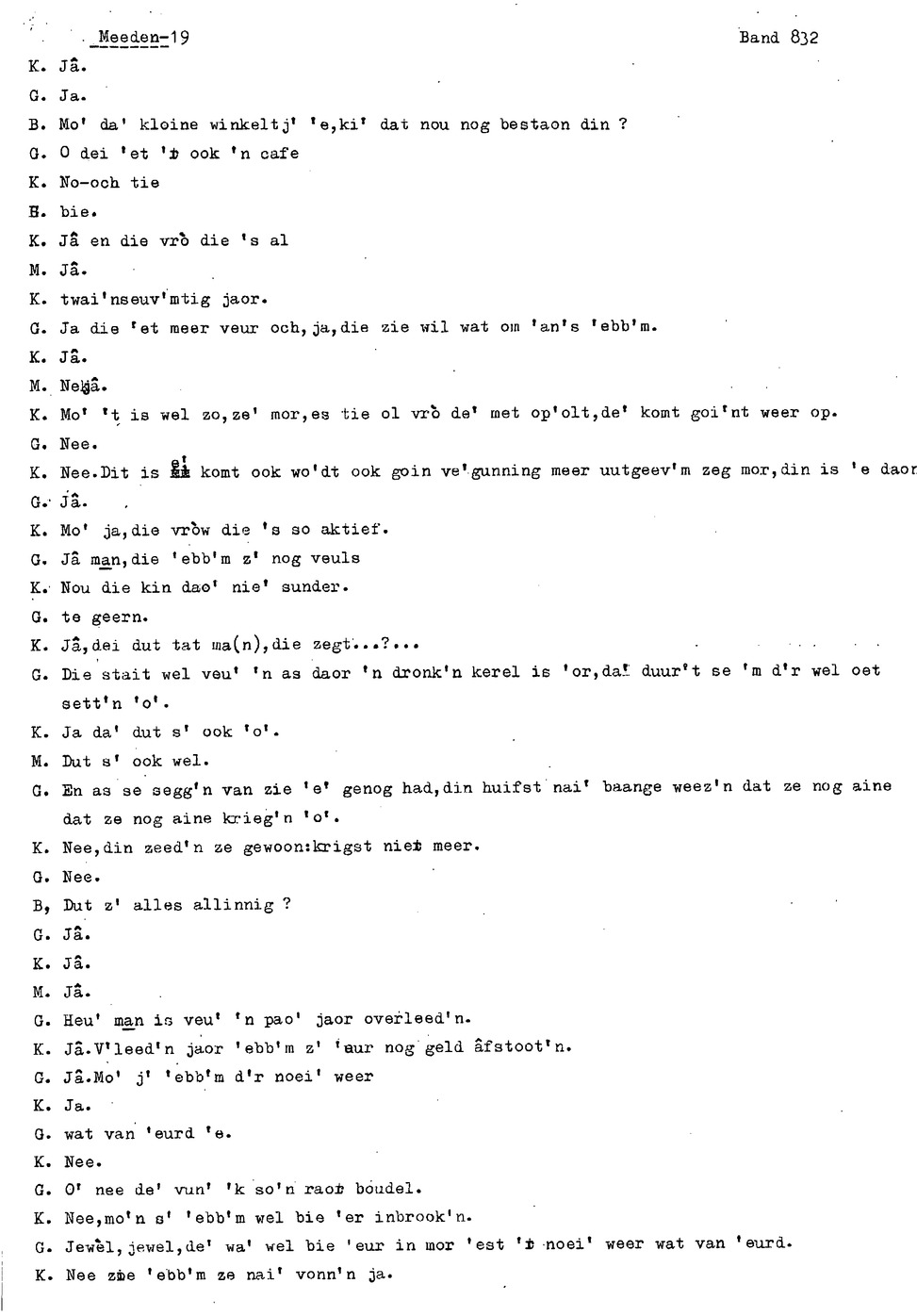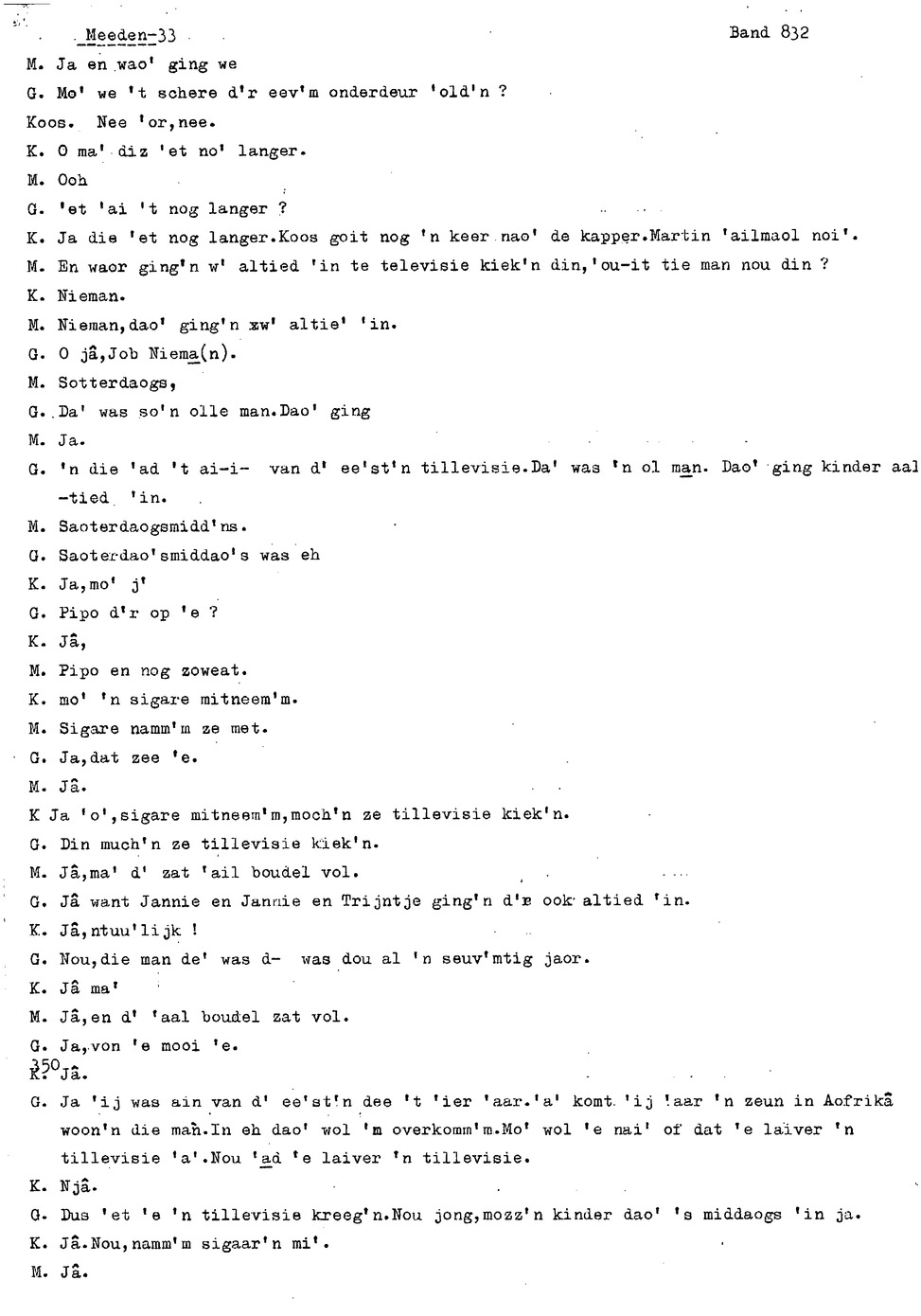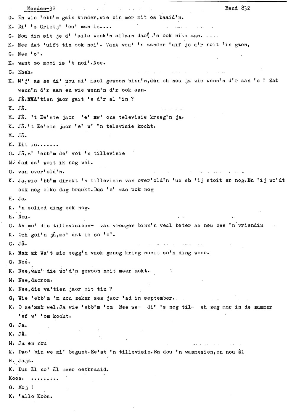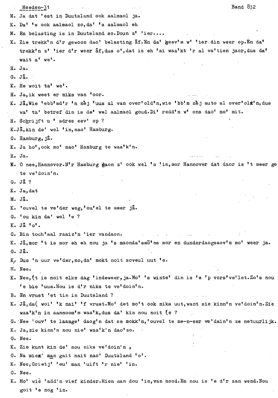 onderwerp: Over toneelspelen.; Over ziekte en ongevallen man spr. 1.; Over plaatsgenoten en kwalen.; Over huis en inrichting, schoonamekn spr. 2 en 3; Over grijze haren, haren verven; Over de plaats Meden: (de importbevolking, velen hebben in Meeden een weekendhuisje, jongelui trekken weg, de scholen, bevolkingsaantal, de nieuwbouw, de winkels, inkpen doen soms in Veendam, Winschoten en Stad; Over oude vrouw met klein winkeltje en caf'e, diefstal bij haar.; Over televisie kijken bij anderen; 370-eind: woorden naar twee tekeningen