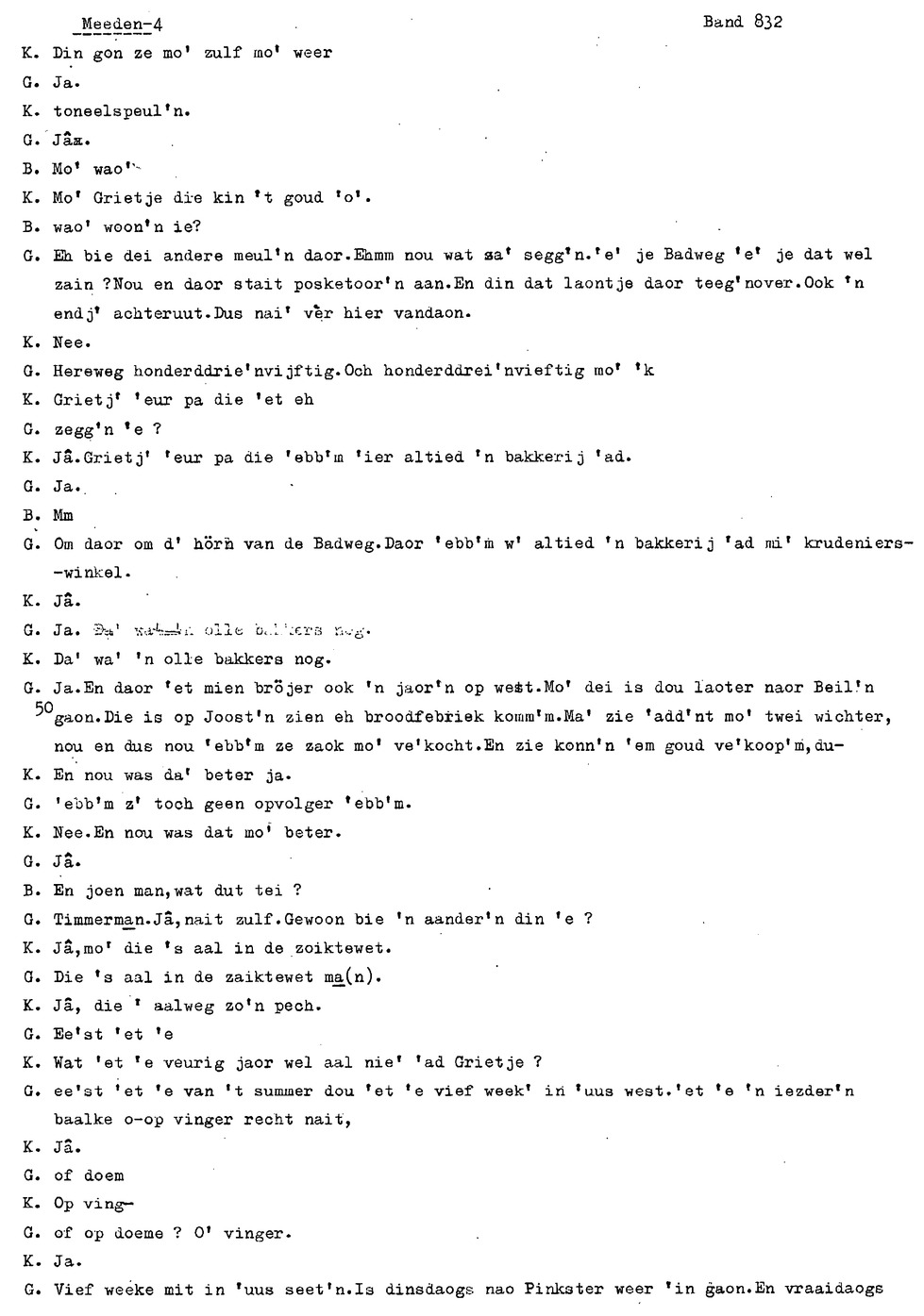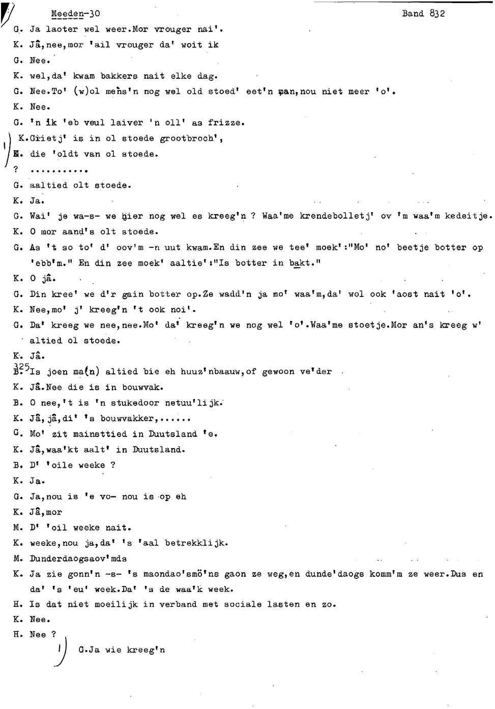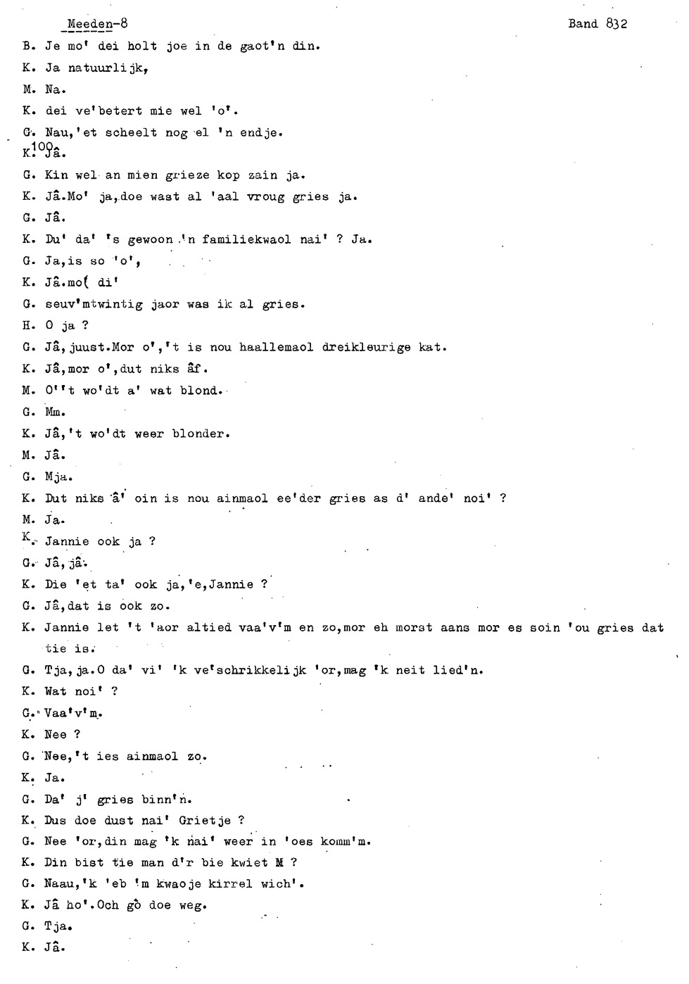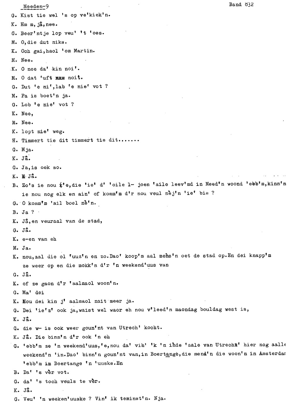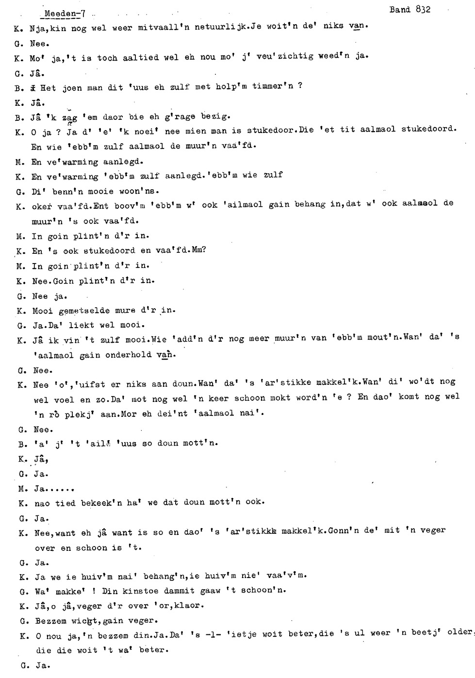 onderwerp: Over toneelspelen.; Over ziekte en ongevallen man spr. 1.; Over plaatsgenoten en kwalen.; Over huis en inrichting, schoonamekn spr. 2 en 3; Over grijze haren, haren verven; Over de plaats Meden: (de importbevolking, velen hebben in Meeden een weekendhuisje, jongelui trekken weg, de scholen, bevolkingsaantal, de nieuwbouw, de winkels, inkpen doen soms in Veendam, Winschoten en Stad; Over oude vrouw met klein winkeltje en caf'e, diefstal bij haar.; Over televisie kijken bij anderen; 370-eind: woorden naar twee tekeningen