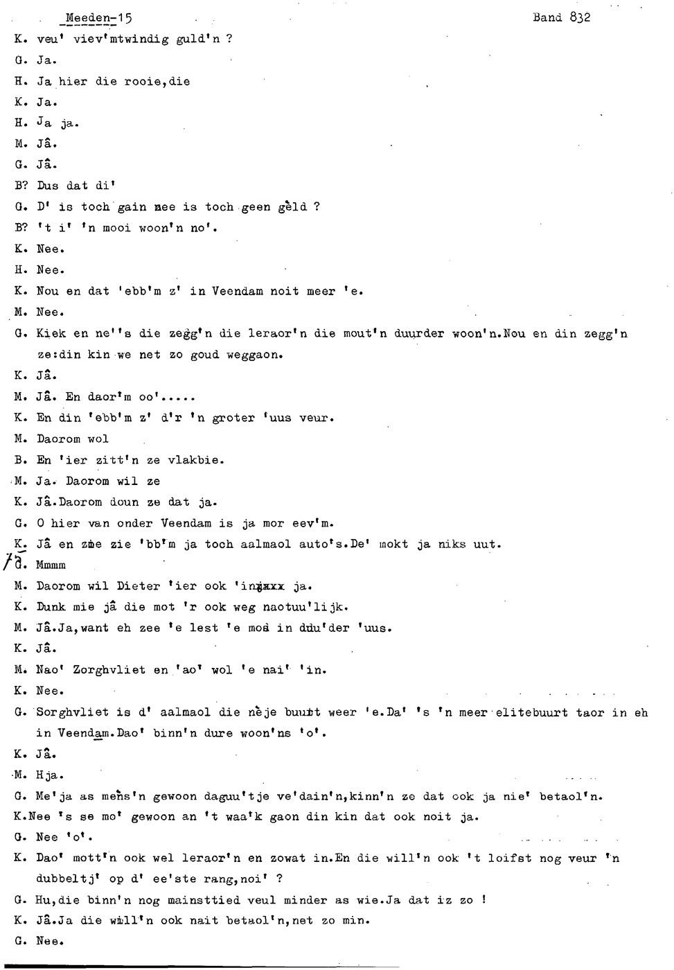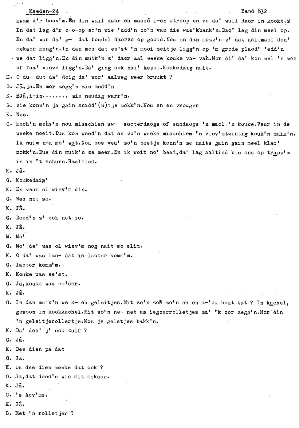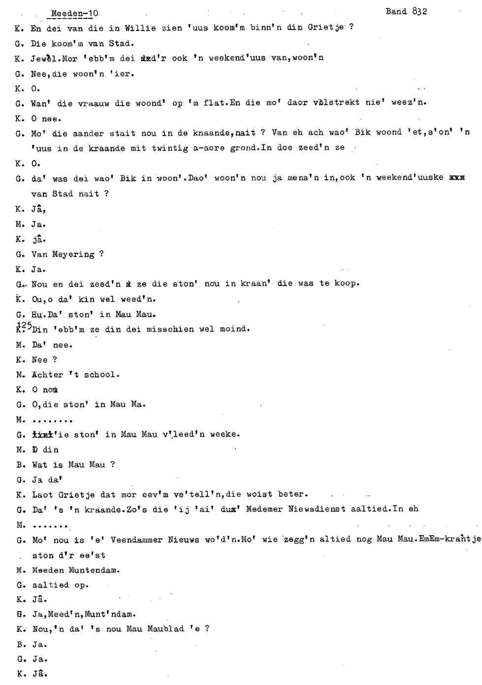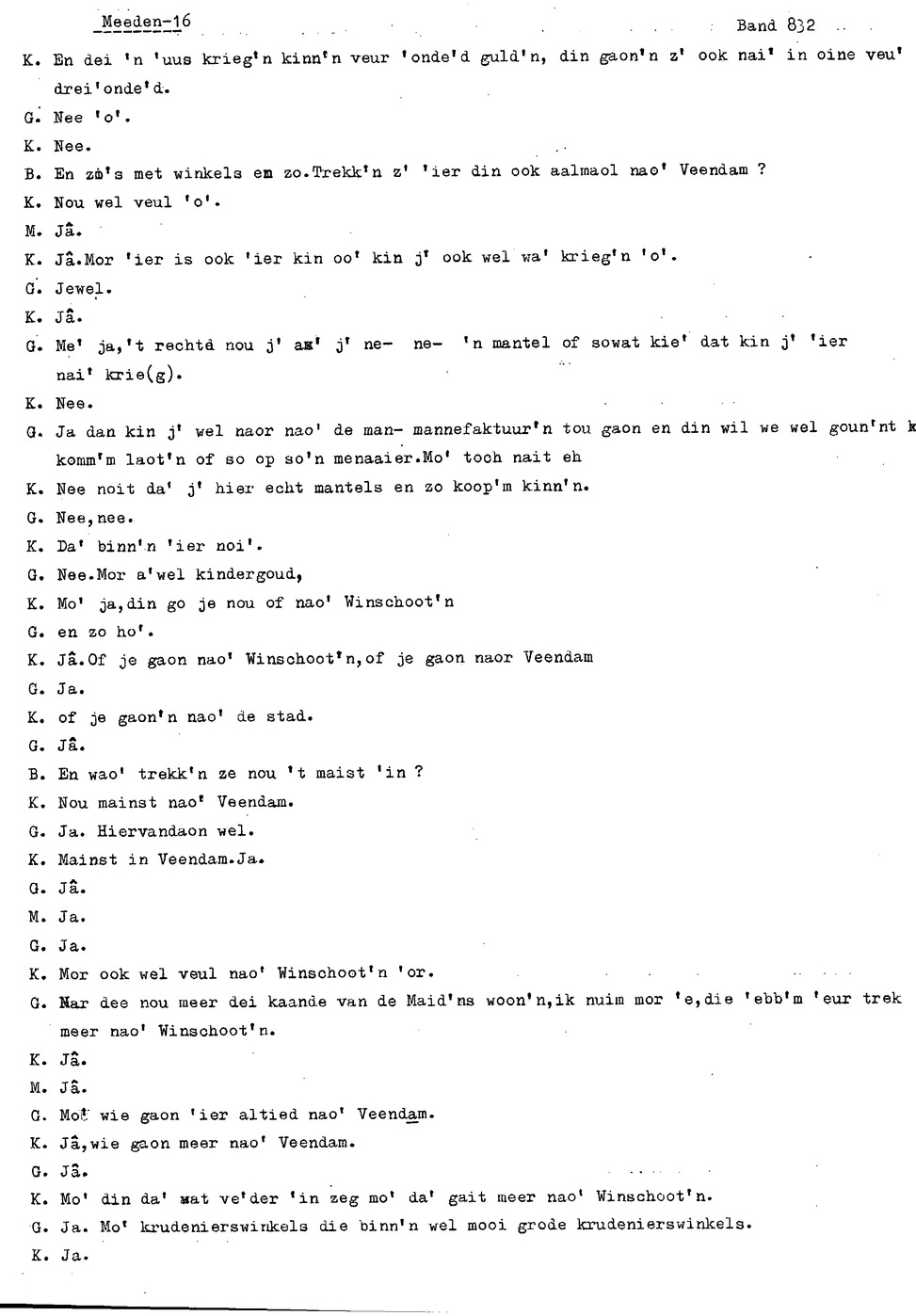 onderwerp: Over toneelspelen.; Over ziekte en ongevallen man spr. 1.; Over plaatsgenoten en kwalen.; Over huis en inrichting, schoonamekn spr. 2 en 3; Over grijze haren, haren verven; Over de plaats Meden: (de importbevolking, velen hebben in Meeden een weekendhuisje, jongelui trekken weg, de scholen, bevolkingsaantal, de nieuwbouw, de winkels, inkpen doen soms in Veendam, Winschoten en Stad; Over oude vrouw met klein winkeltje en caf'e, diefstal bij haar.; Over televisie kijken bij anderen; 370-eind: woorden naar twee tekeningen