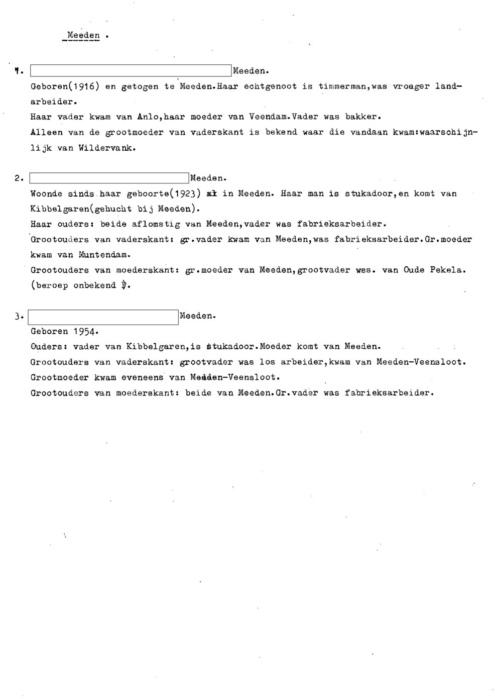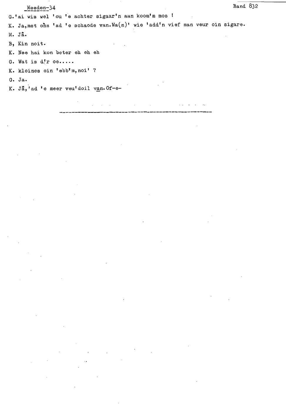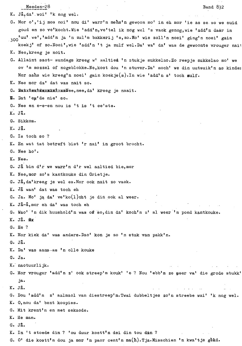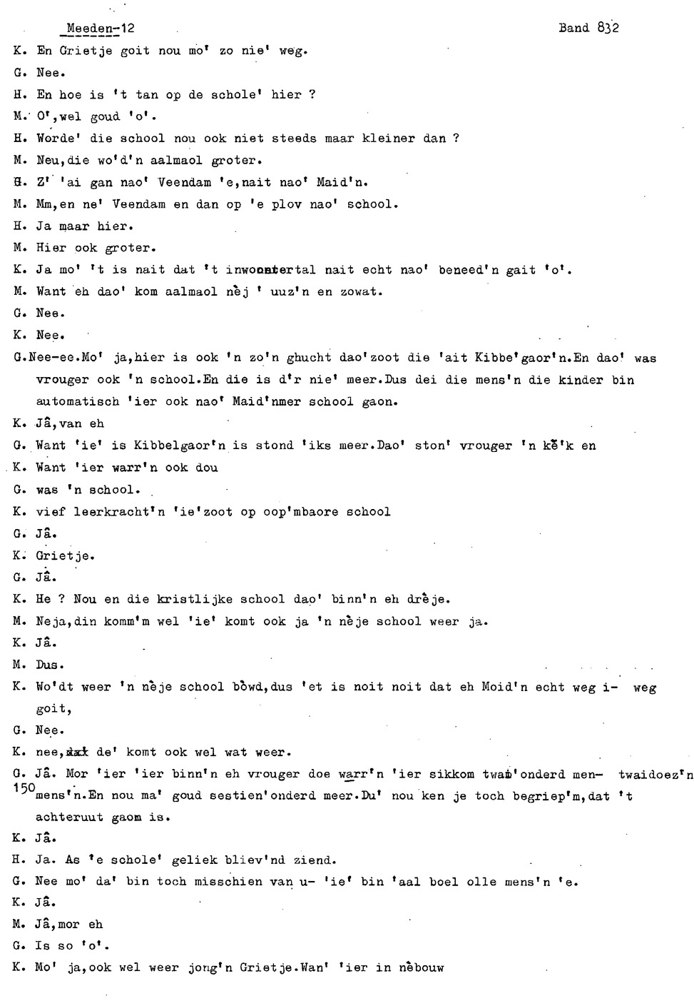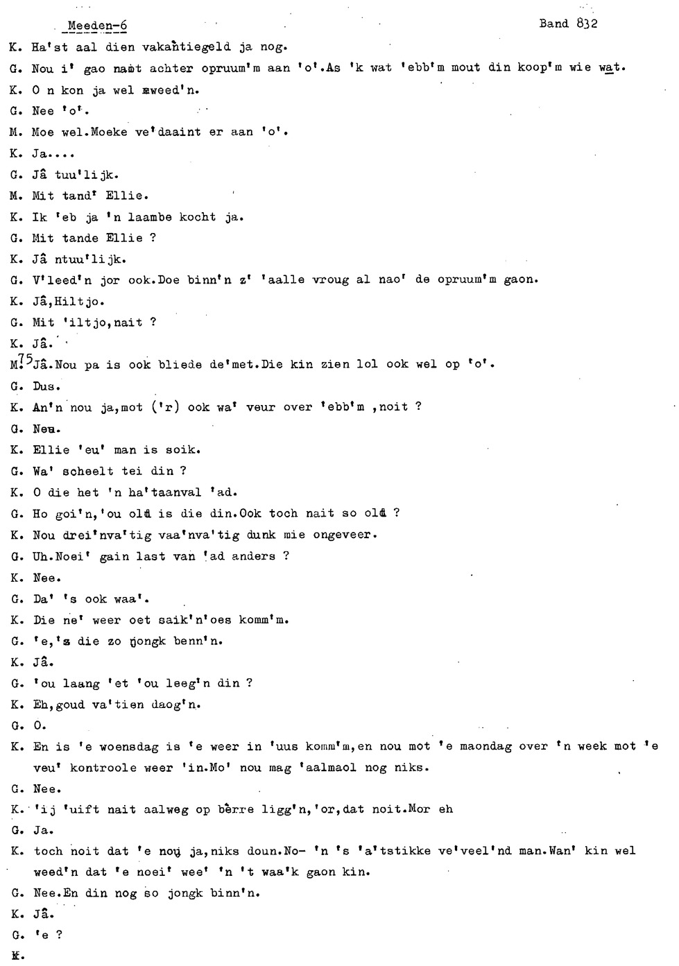 onderwerp: Over toneelspelen.; Over ziekte en ongevallen man spr. 1.; Over plaatsgenoten en kwalen.; Over huis en inrichting, schoonamekn spr. 2 en 3; Over grijze haren, haren verven; Over de plaats Meden: (de importbevolking, velen hebben in Meeden een weekendhuisje, jongelui trekken weg, de scholen, bevolkingsaantal, de nieuwbouw, de winkels, inkpen doen soms in Veendam, Winschoten en Stad; Over oude vrouw met klein winkeltje en caf'e, diefstal bij haar.; Over televisie kijken bij anderen; 370-eind: woorden naar twee tekeningen