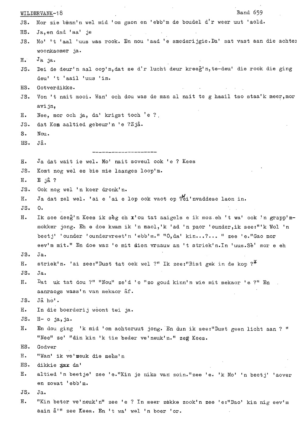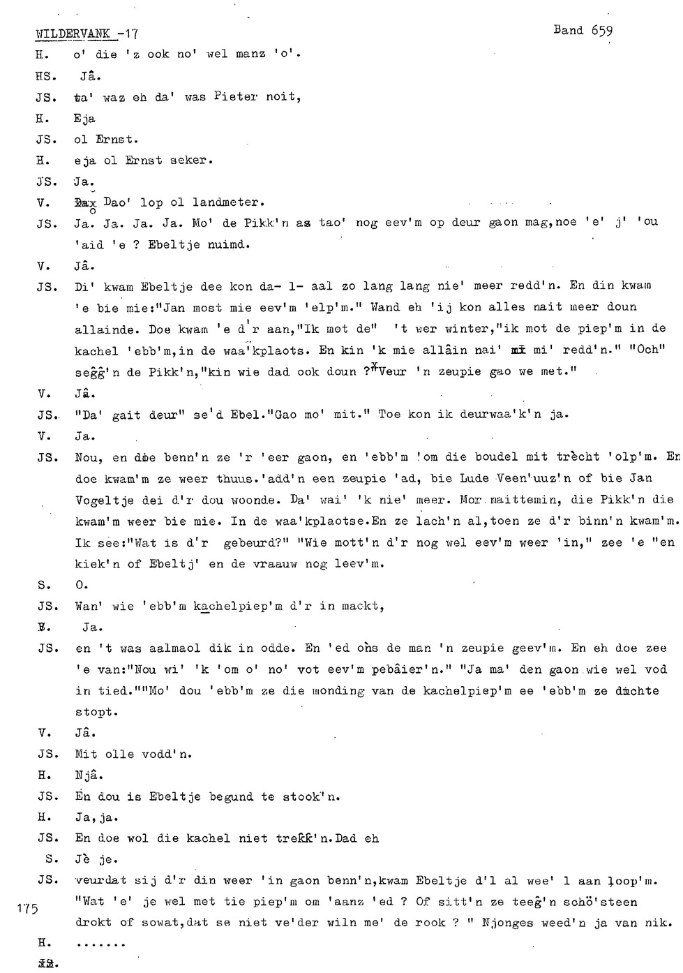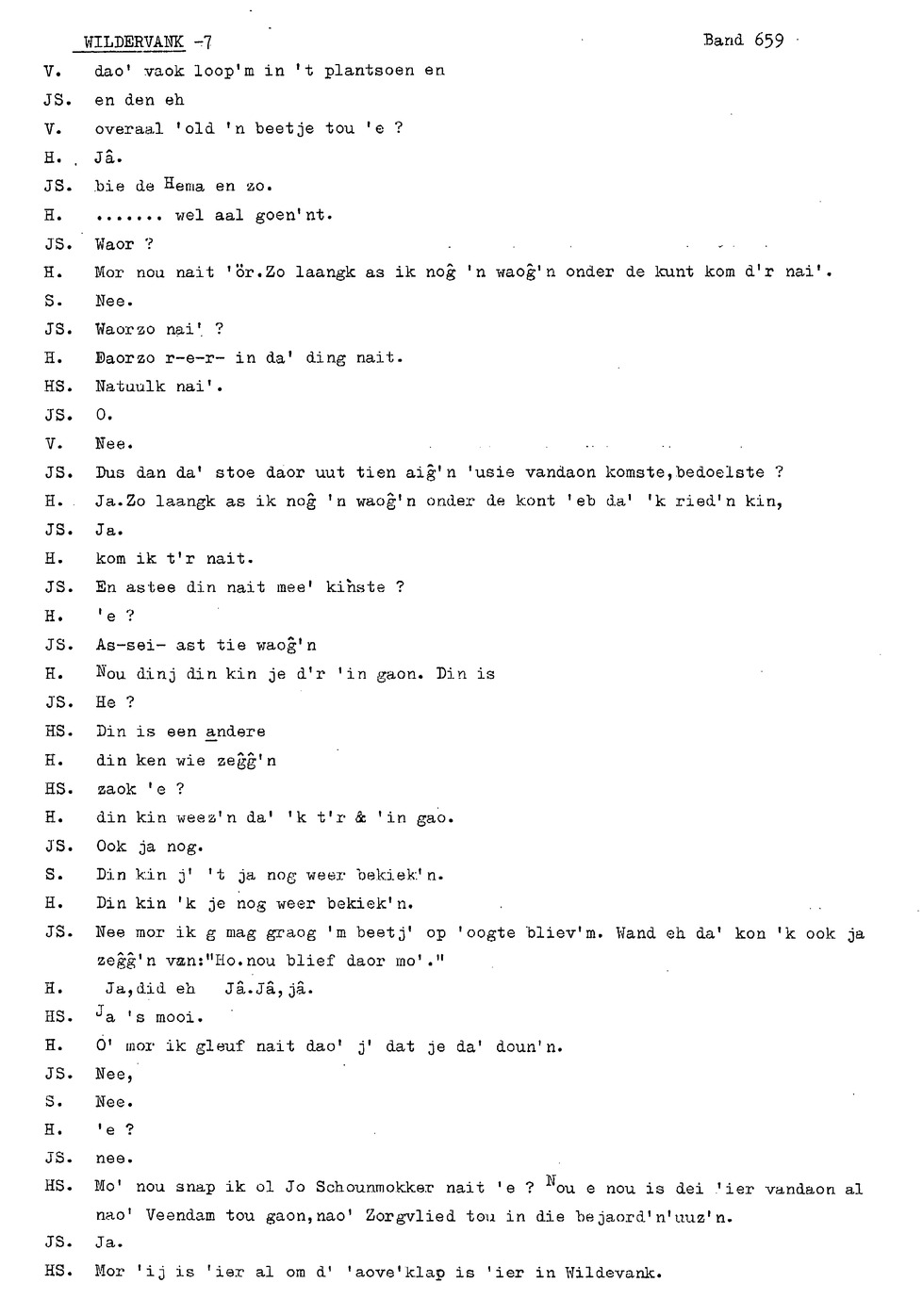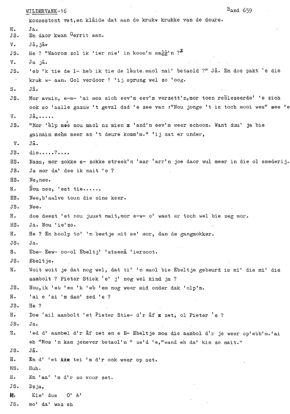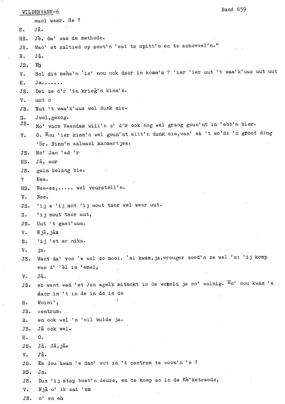 Over iemand: ‘t Wa' wel ‘n boer ‘or. Kin beter ve'neuk'n”zee en “Dao' kin nig eev'm aain a!”; Verhaal over “'t pi'dje “ dat er vandoor ging, over een praamtocht bij stormweer:”In wat gev God? Daor is net so'n a-weer zo'n klain broggie.”; Verhaal over voor de gek houden van kollega: gekookt ei verwisseln voor een rauw exemplaar.