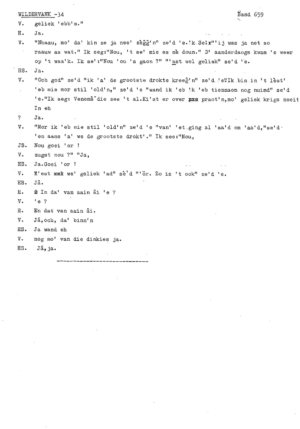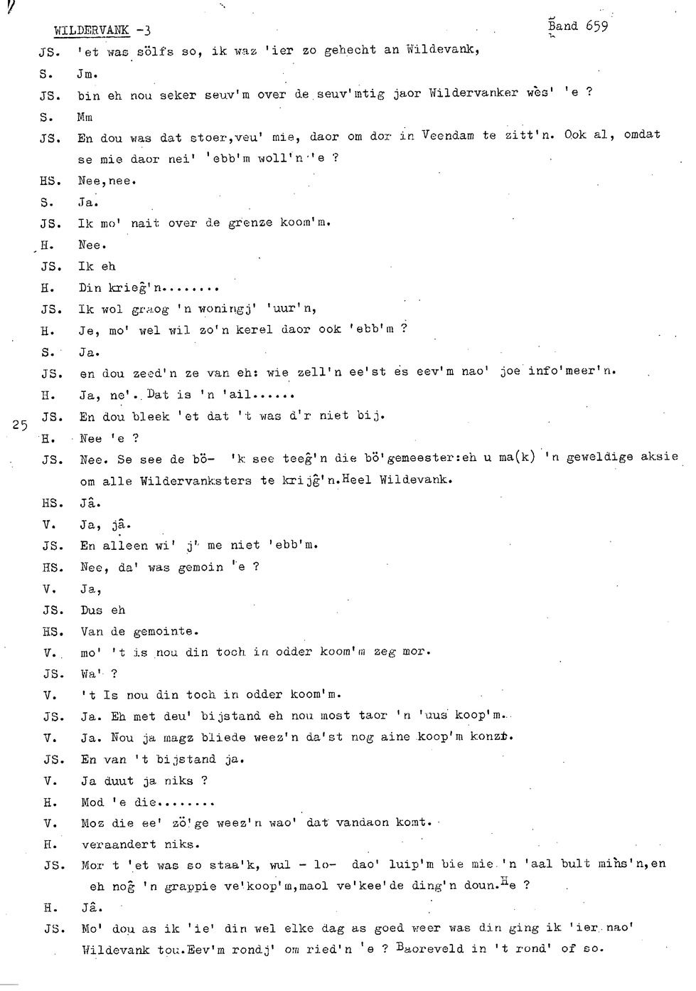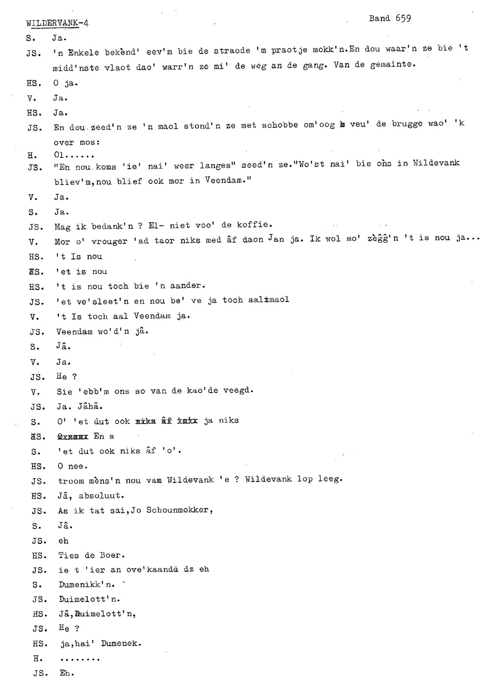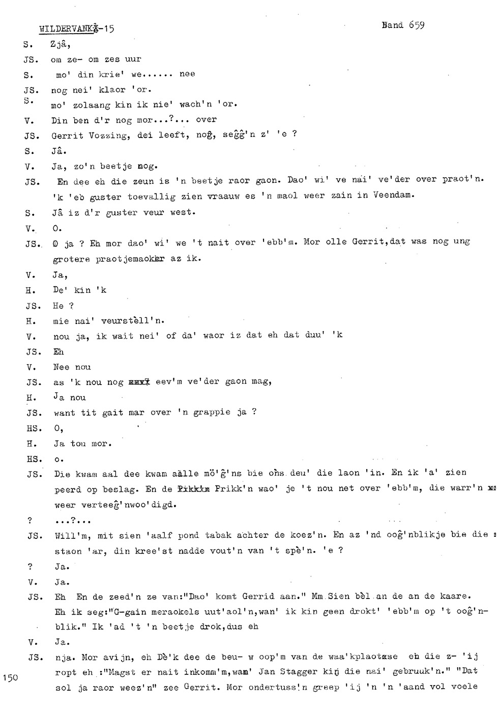 Over iemand: ‘t Wa' wel ‘n boer ‘or. Kin beter ve'neuk'n”zee en “Dao' kin nig eev'm aain a!”; Verhaal over “'t pi'dje “ dat er vandoor ging, over een praamtocht bij stormweer:”In wat gev God? Daor is net so'n a-weer zo'n klain broggie.”; Verhaal over voor de gek houden van kollega: gekookt ei verwisseln voor een rauw exemplaar.