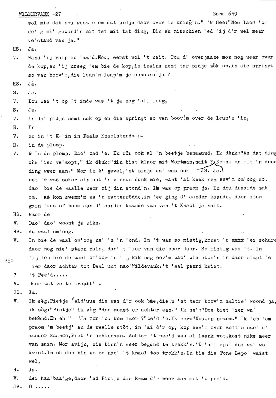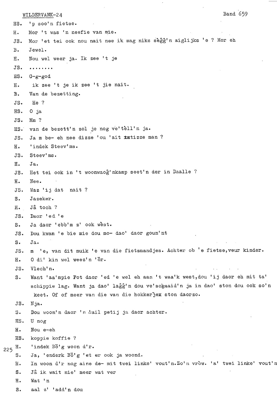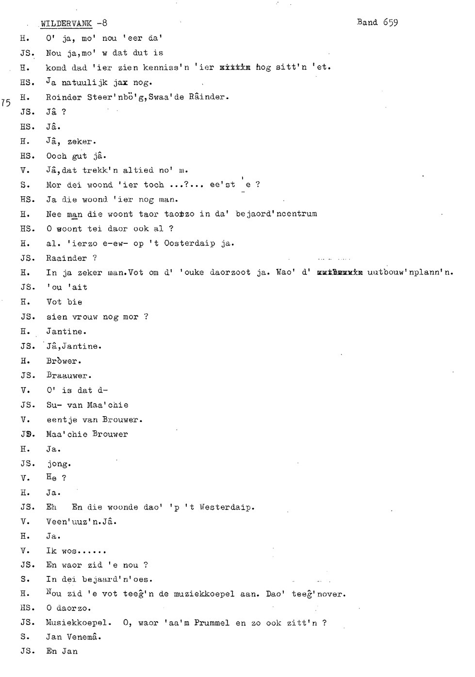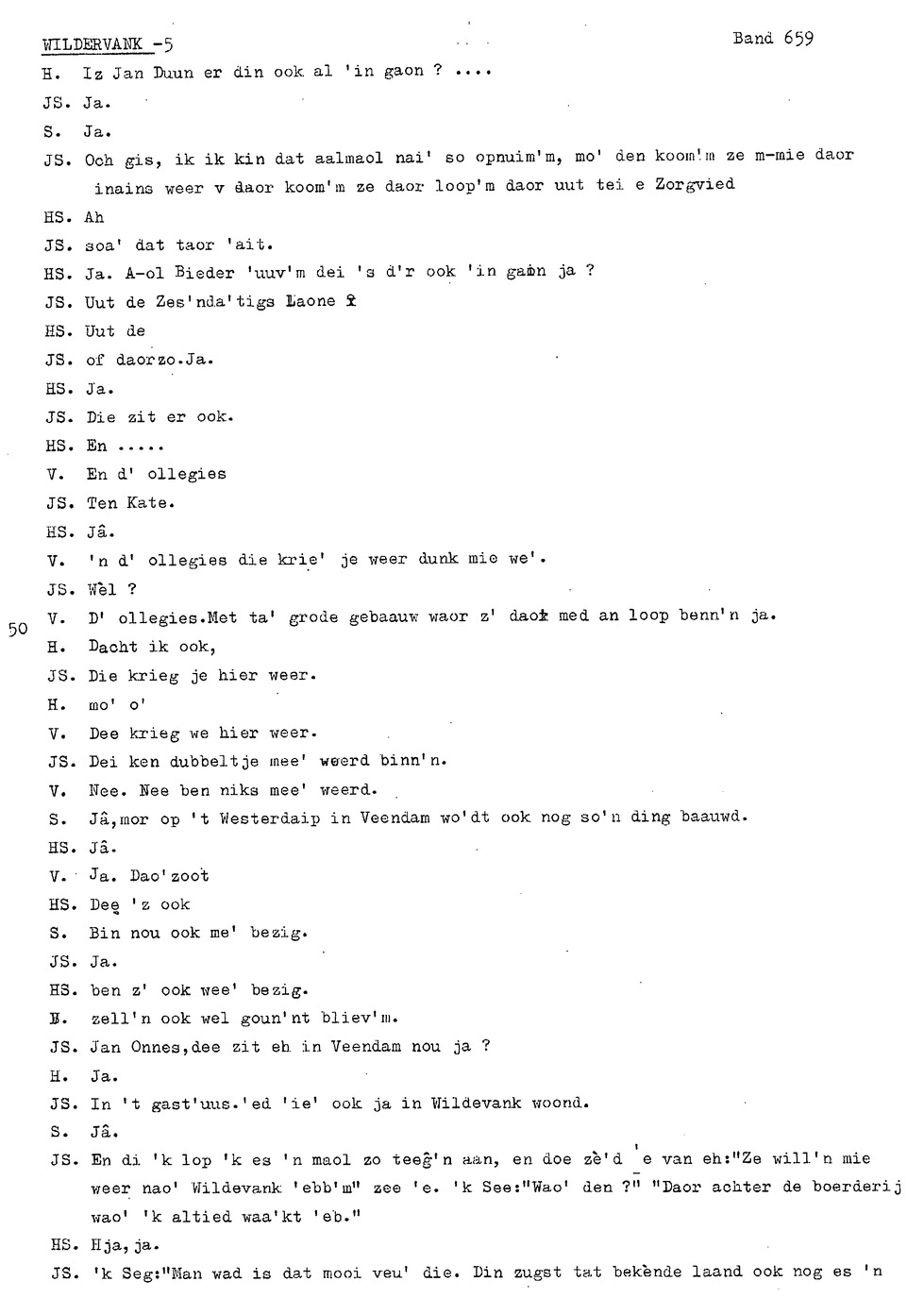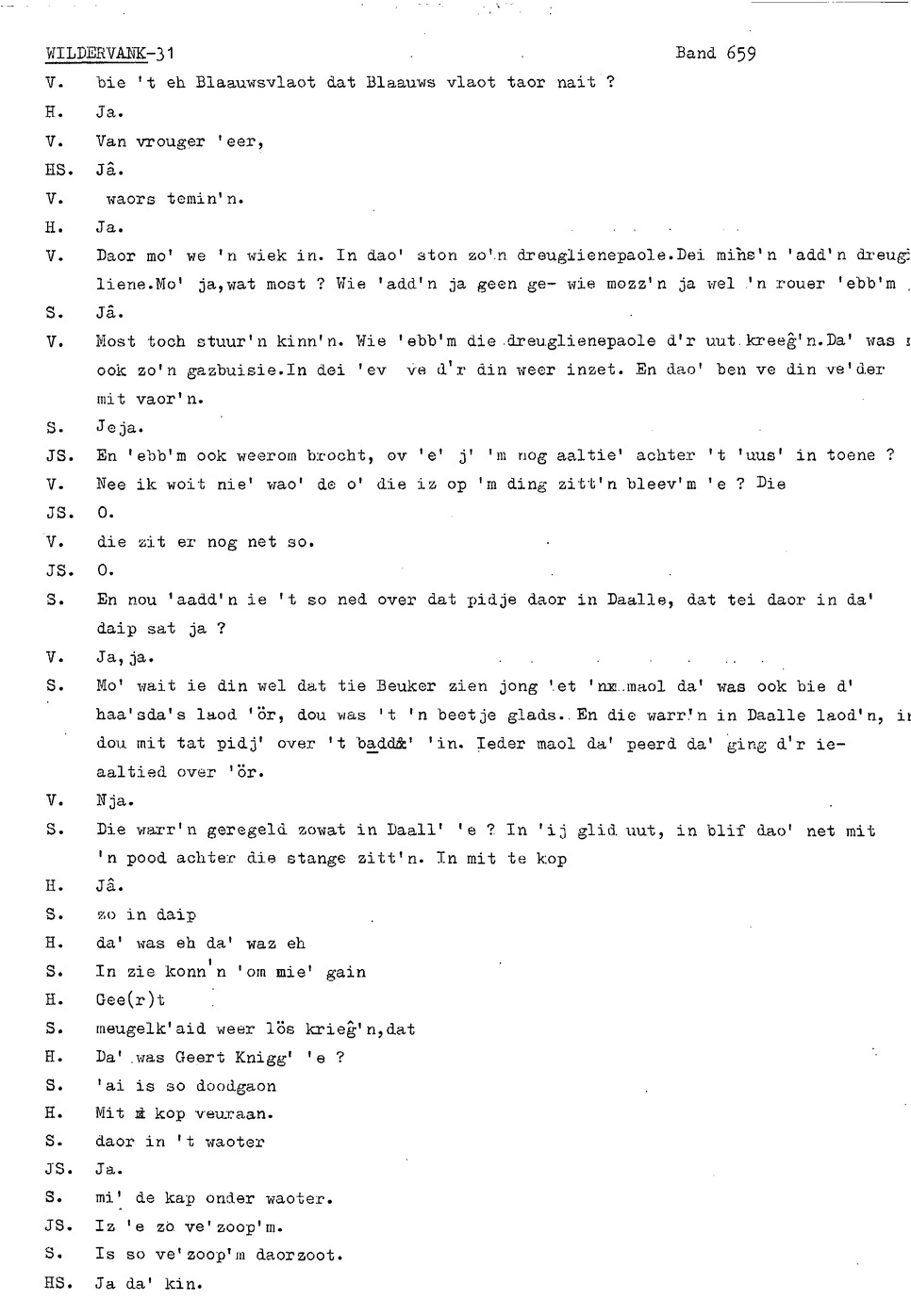 Over iemand: ‘t Wa' wel ‘n boer ‘or. Kin beter ve'neuk'n”zee en “Dao' kin nig eev'm aain a!”; Verhaal over “'t pi'dje “ dat er vandoor ging, over een praamtocht bij stormweer:”In wat gev God? Daor is net so'n a-weer zo'n klain broggie.”; Verhaal over voor de gek houden van kollega: gekookt ei verwisseln voor een rauw exemplaar.