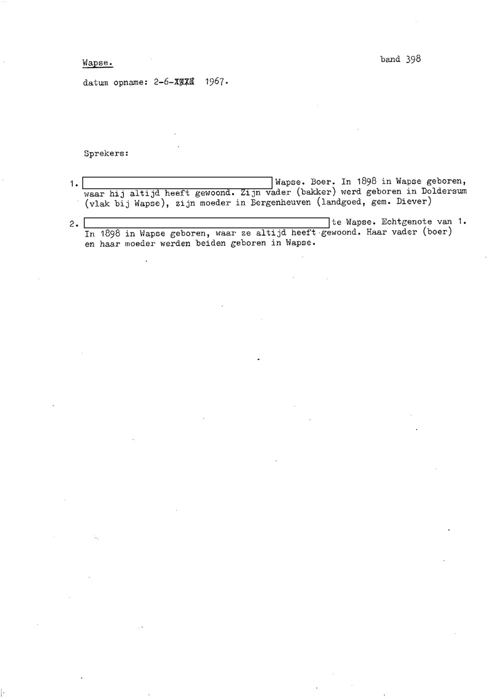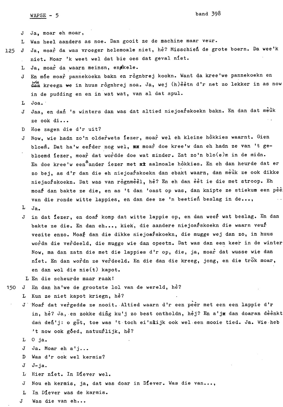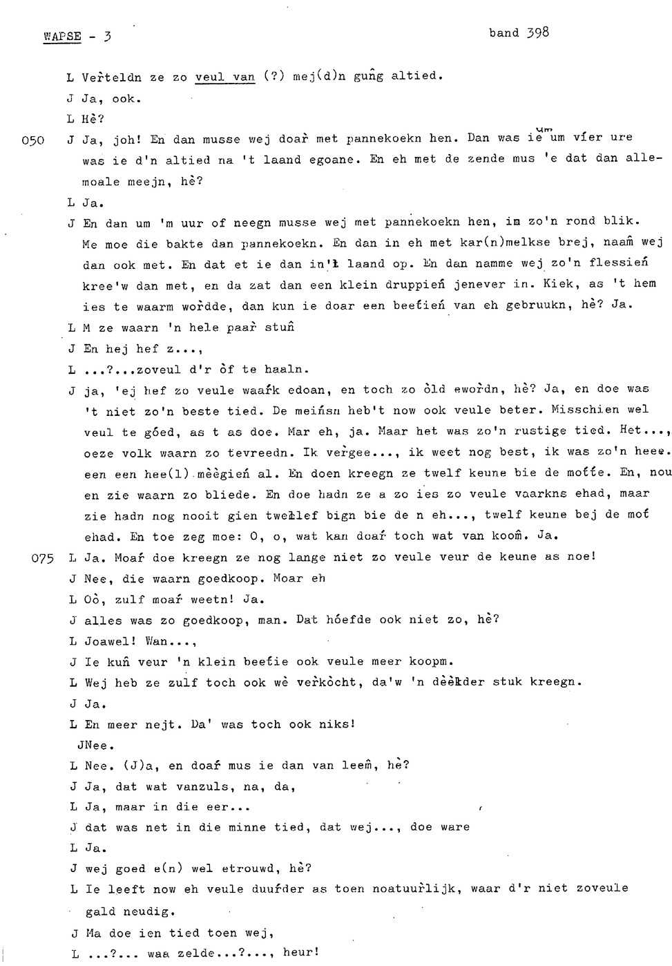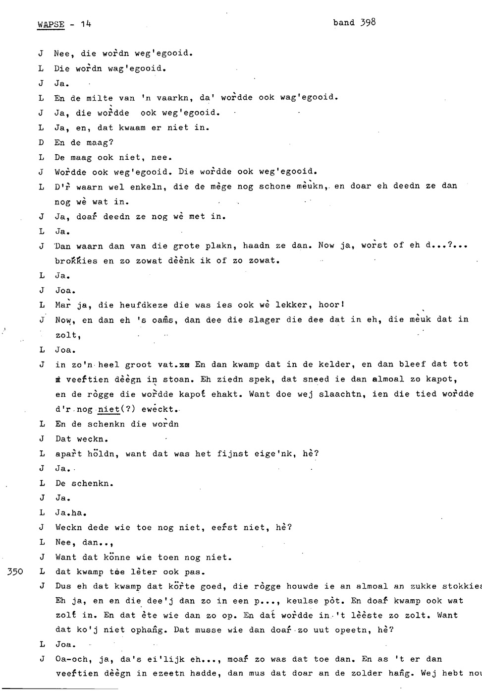 onderwerp: over lang praten; over sterfgevallen; over vader informant 2 ; over vroeger: met minder tevreden; kleding vroeger; eten vroeger; kermis; spinmaal van jongens en meisjes; dronken herders van schaapskudde; huisslacht; veranderingen tijdens 44 jaar huwelijk; meer broodbeleg dan vroeger; ; ;