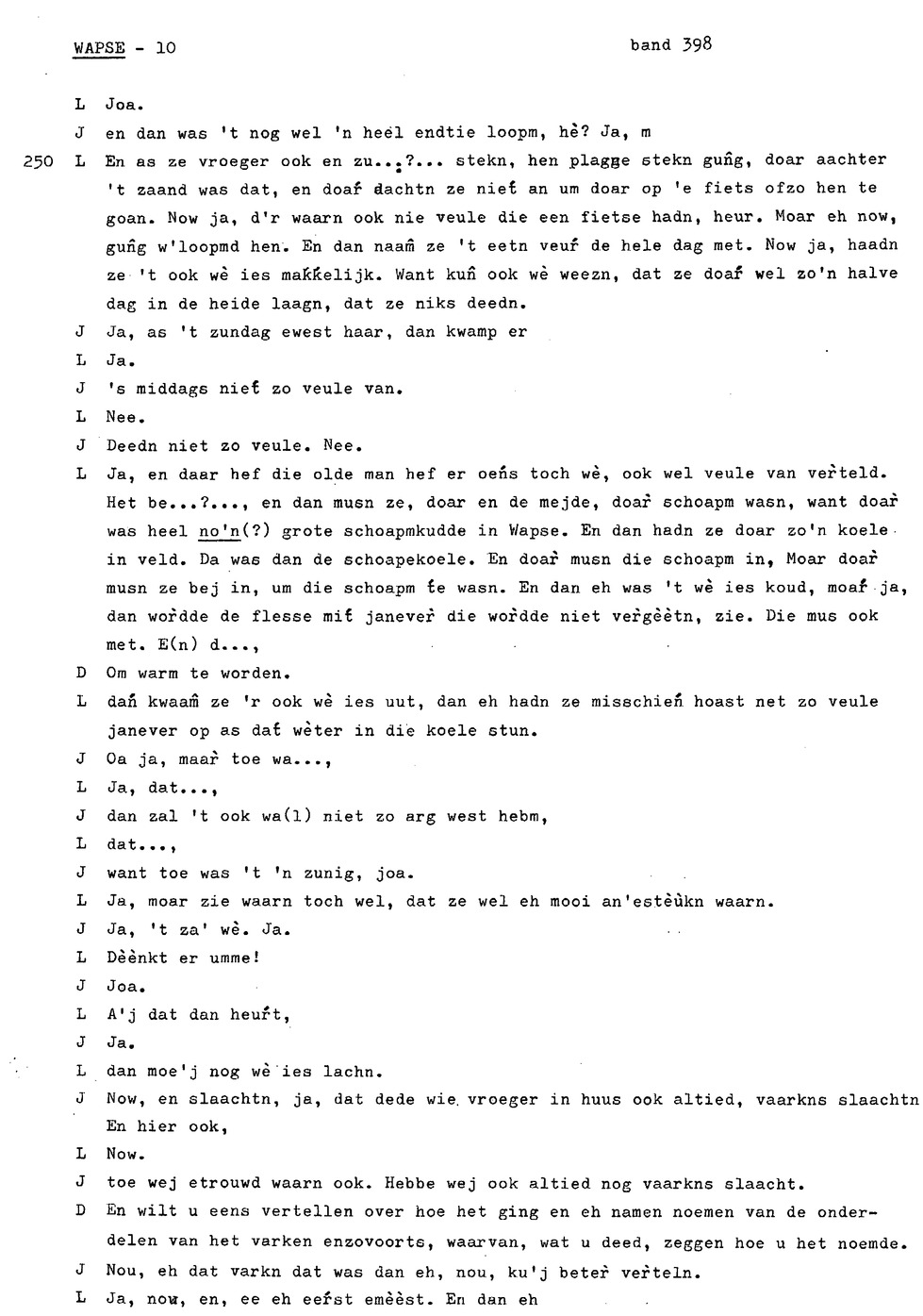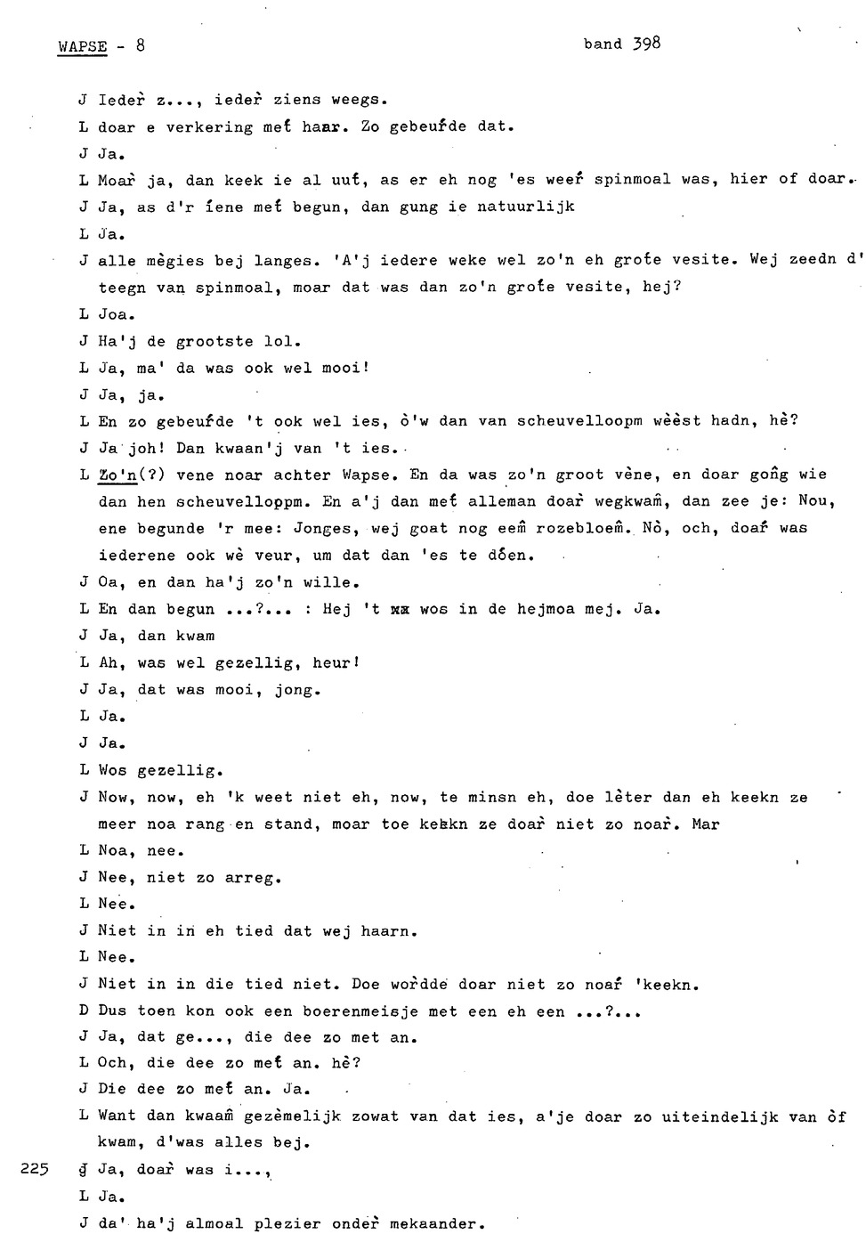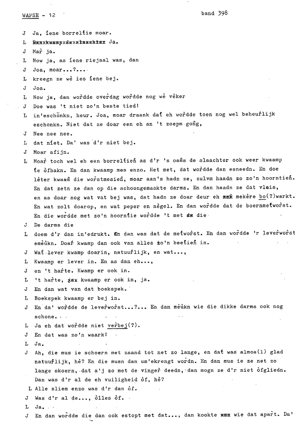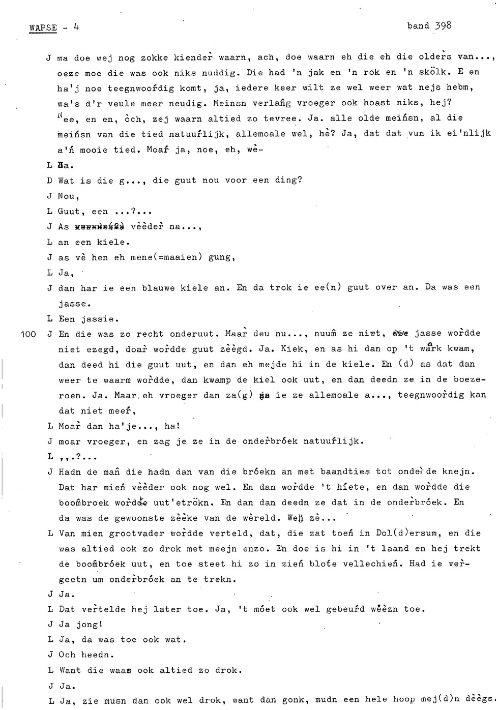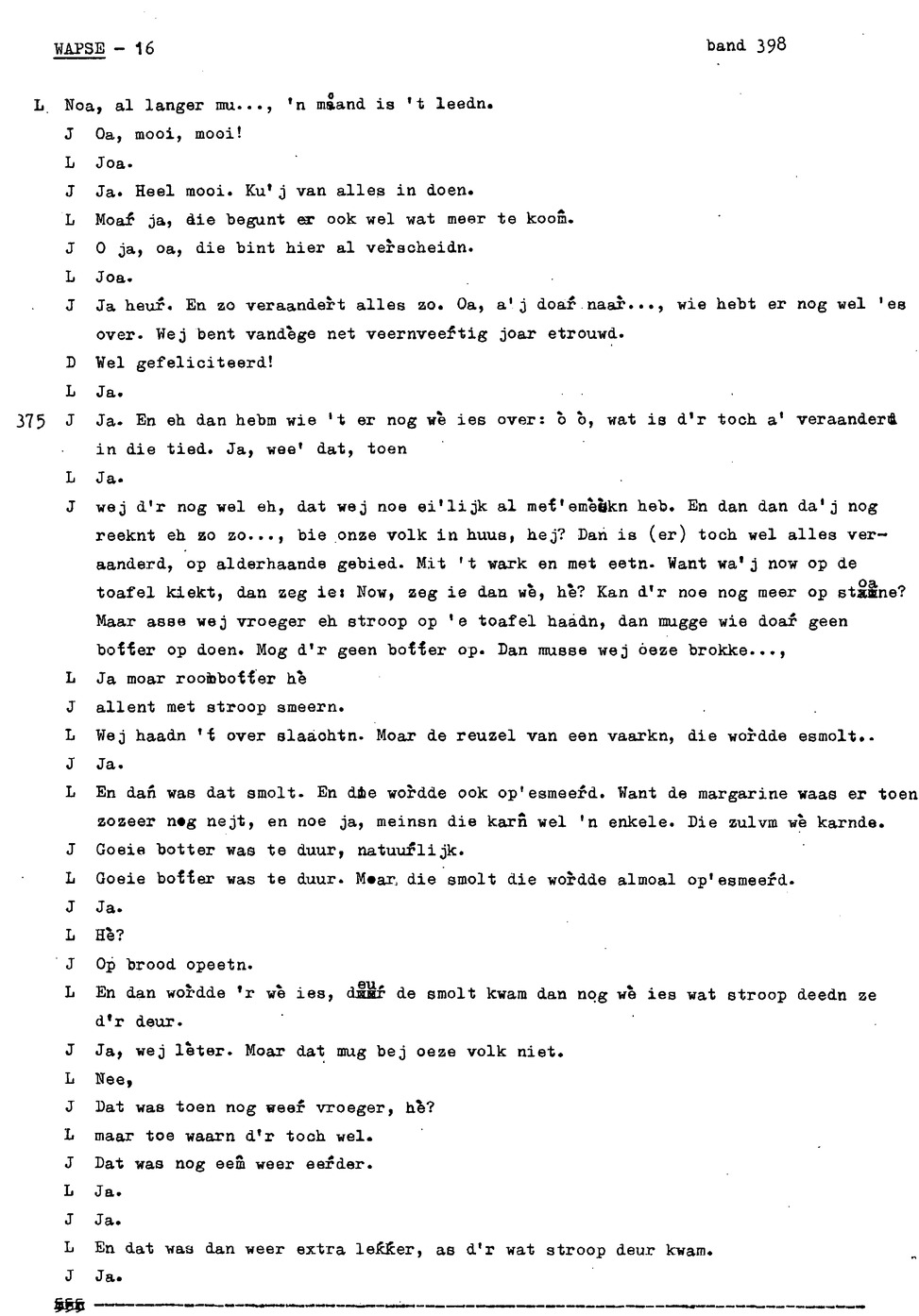 onderwerp: over lang praten; over sterfgevallen; over vader informant 2 ; over vroeger: met minder tevreden; kleding vroeger; eten vroeger; kermis; spinmaal van jongens en meisjes; dronken herders van schaapskudde; huisslacht; veranderingen tijdens 44 jaar huwelijk; meer broodbeleg dan vroeger; ; ;