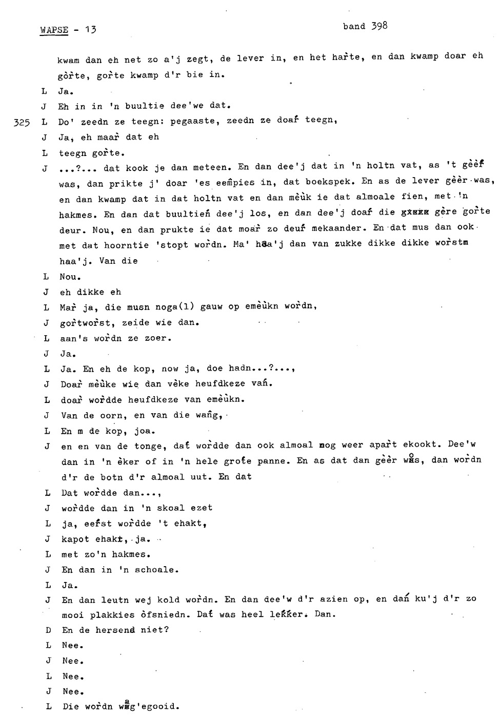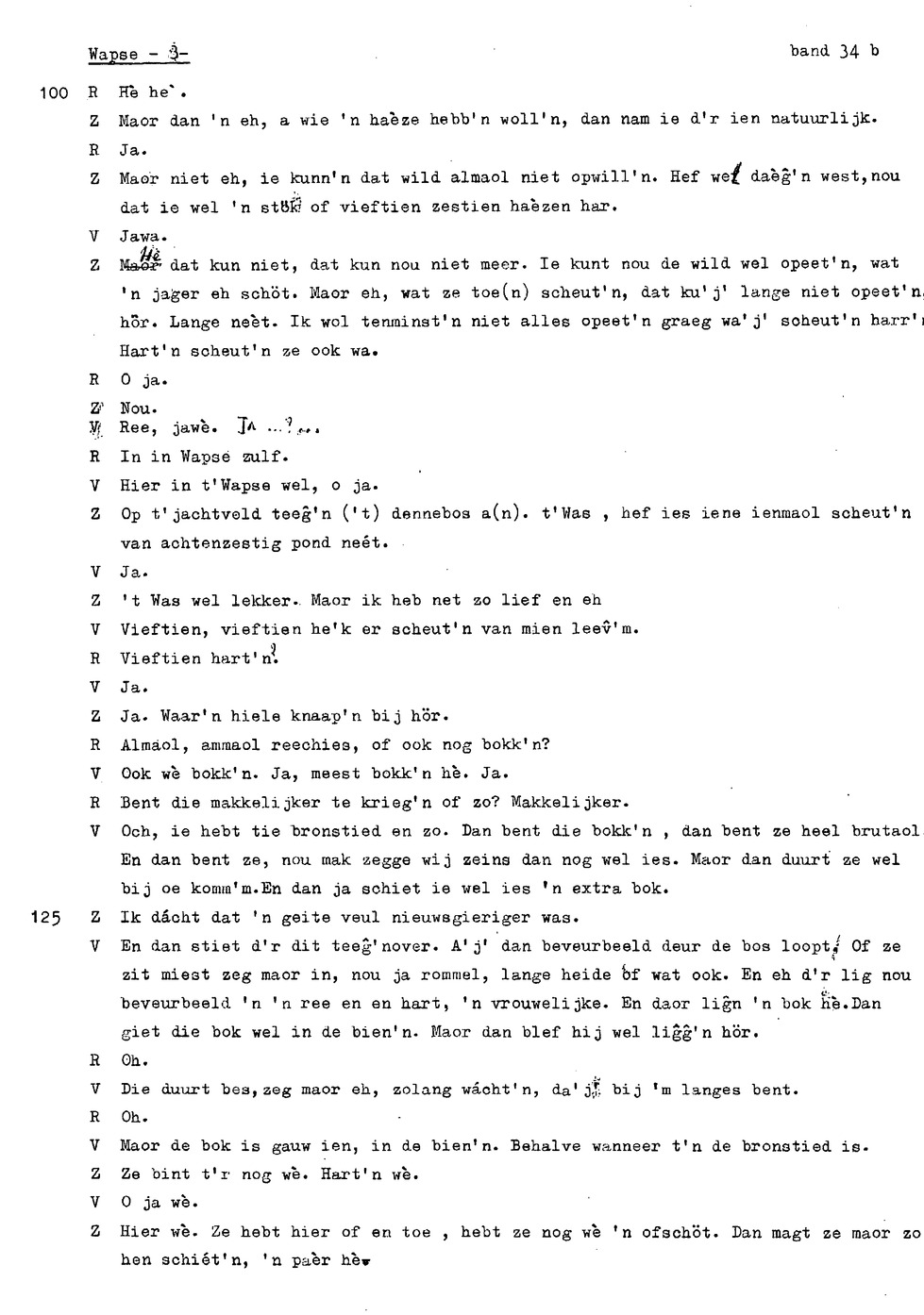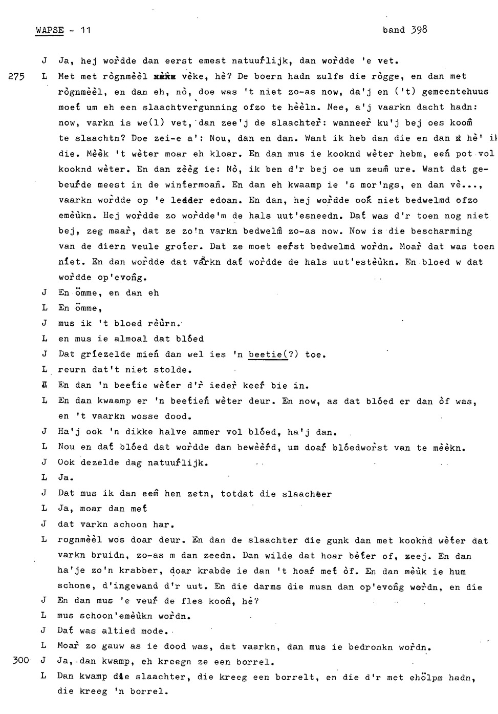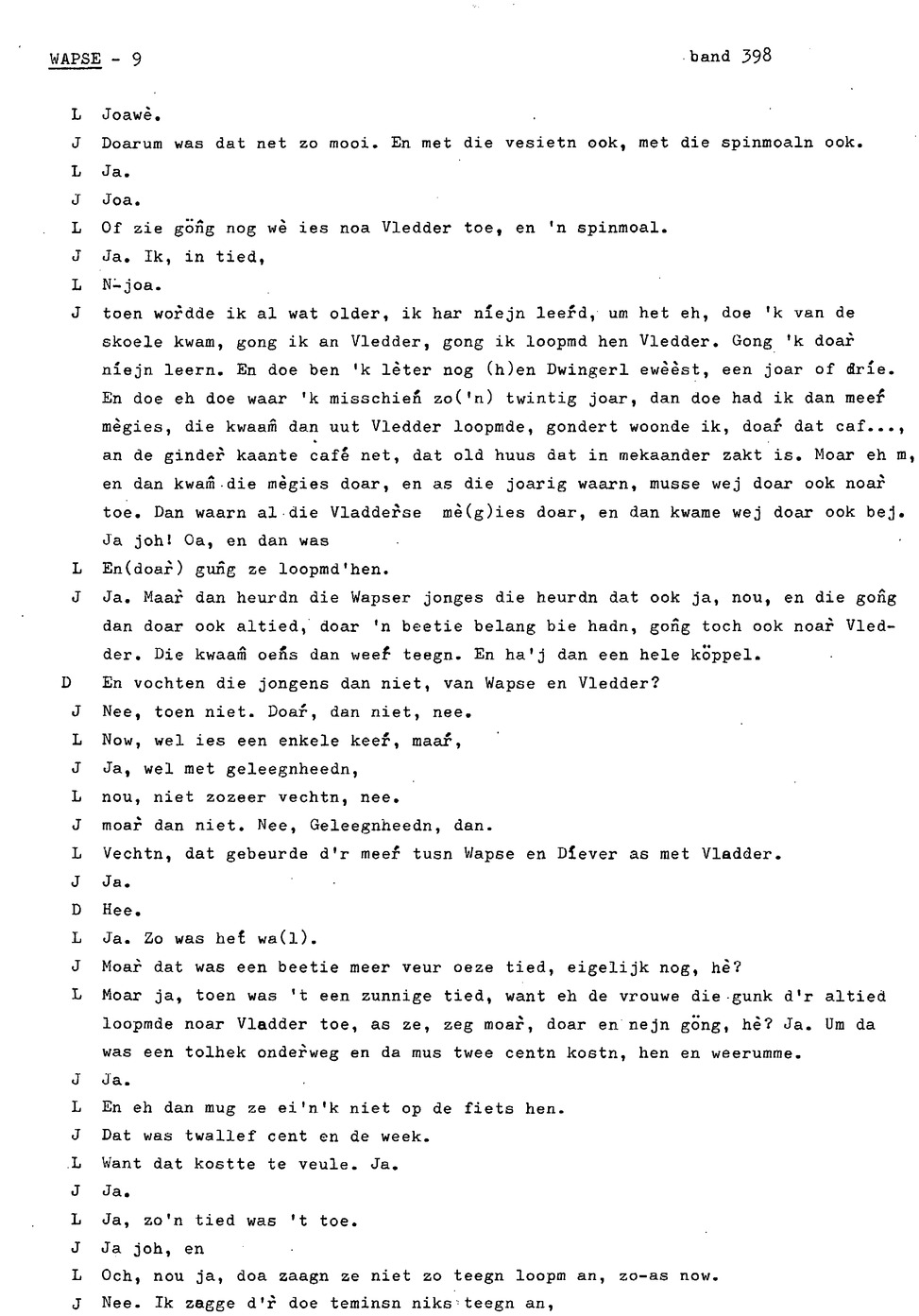 onderwerp: over lang praten; over sterfgevallen; over vader informant 2 ; over vroeger: met minder tevreden; kleding vroeger; eten vroeger; kermis; spinmaal van jongens en meisjes; dronken herders van schaapskudde; huisslacht; veranderingen tijdens 44 jaar huwelijk; meer broodbeleg dan vroeger; ; ;