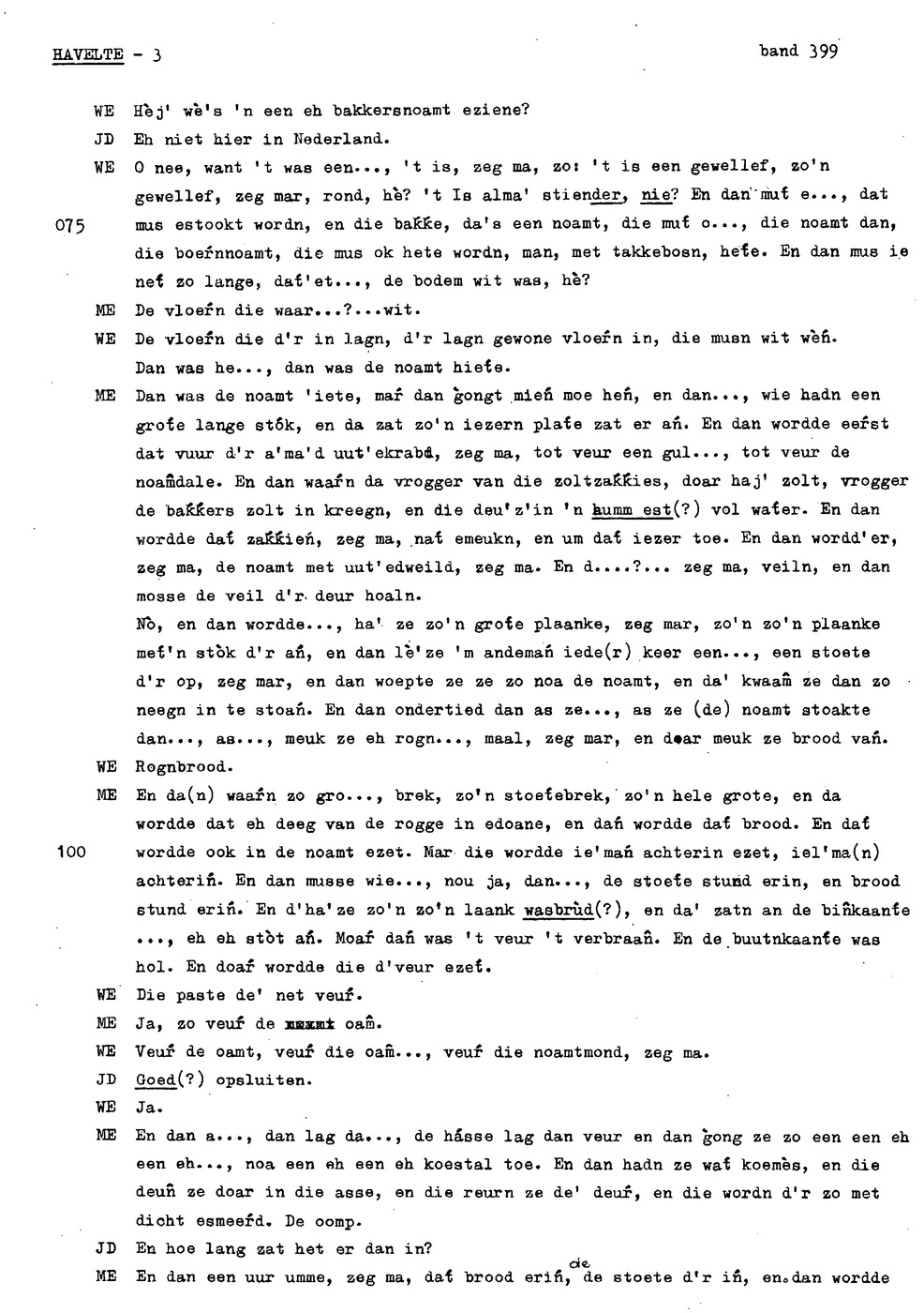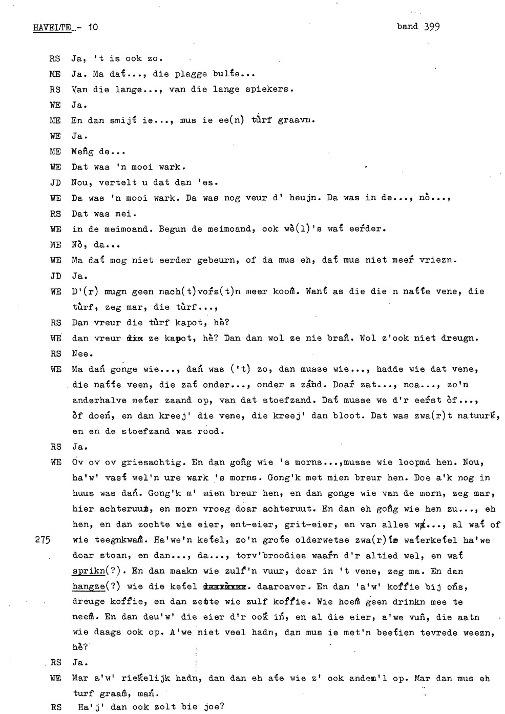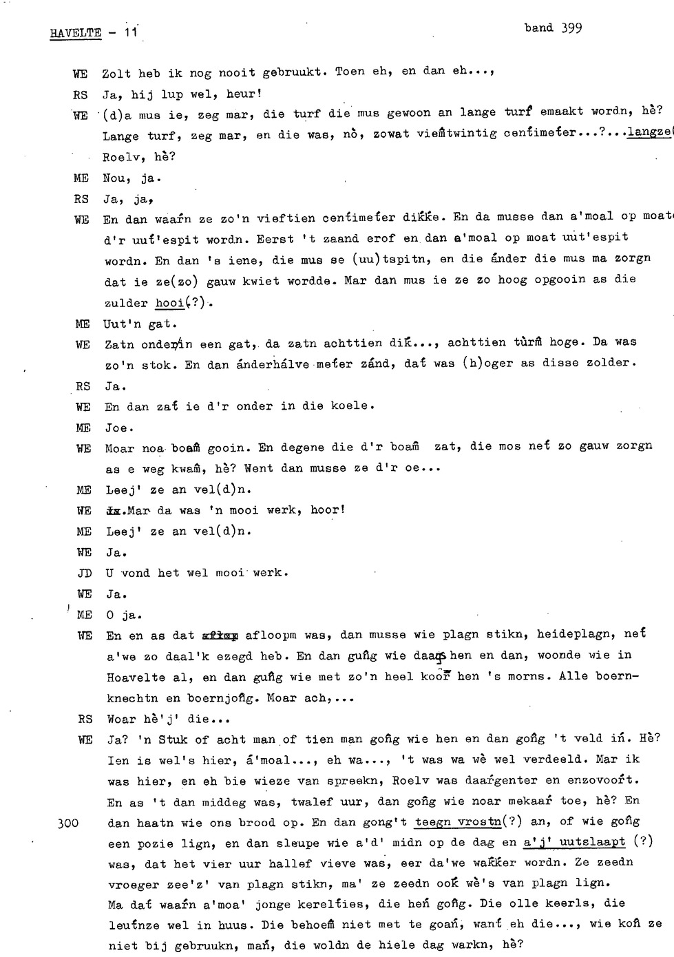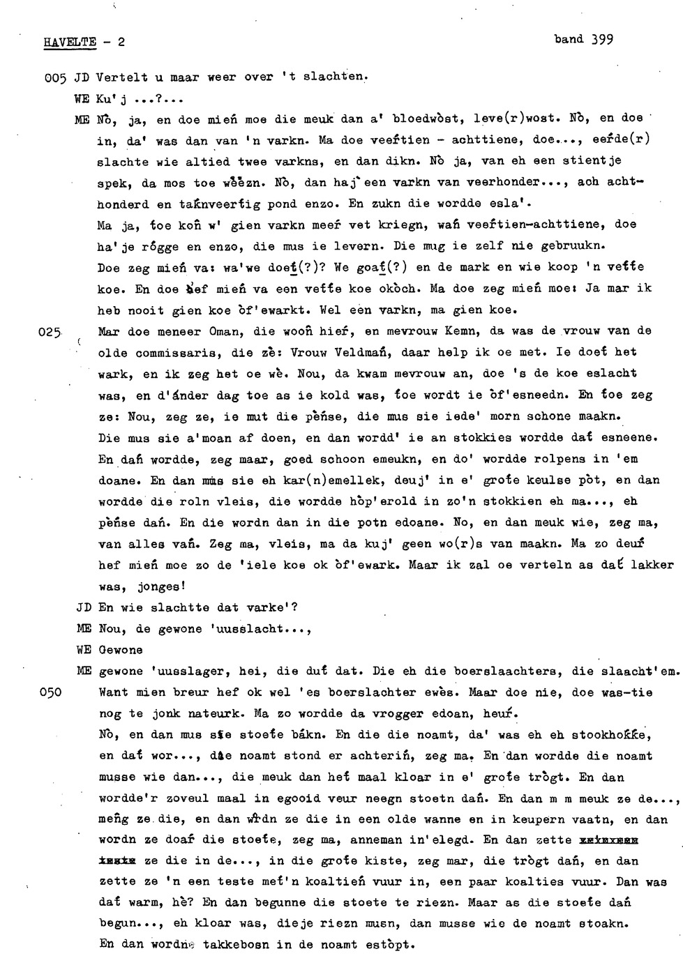 onderwerp: huisslacht; bakken in de oven (‘noamt'); kinderen helpen met koeien op land; eten van opbrengst bedrijf ipv inkopen; over soort toffees (‘kakkeien'); kinderen aten staand bij tafel; personalia: op 12e gaan werken, eerst bij ouders later bij anderen; hooien; handmatig maaien ; verloop werkdag op land; turfwinning; plaggen steken; over karnen met karnmolen; dorsen; pannenkoeken bakken als kind; informant 3 heeft hekel aan boerenbedrijf gekregen; turfwinning; boekweit; ;