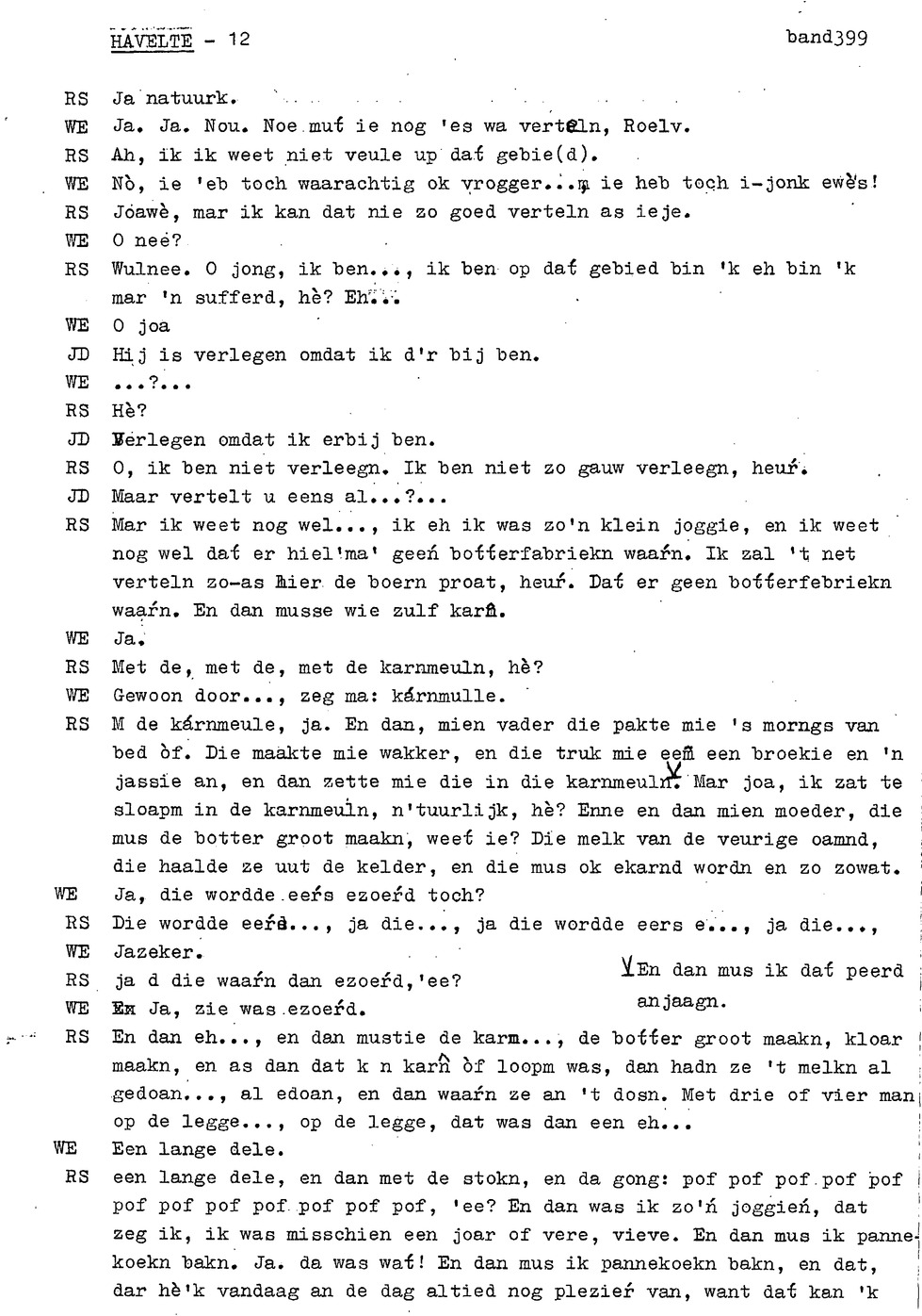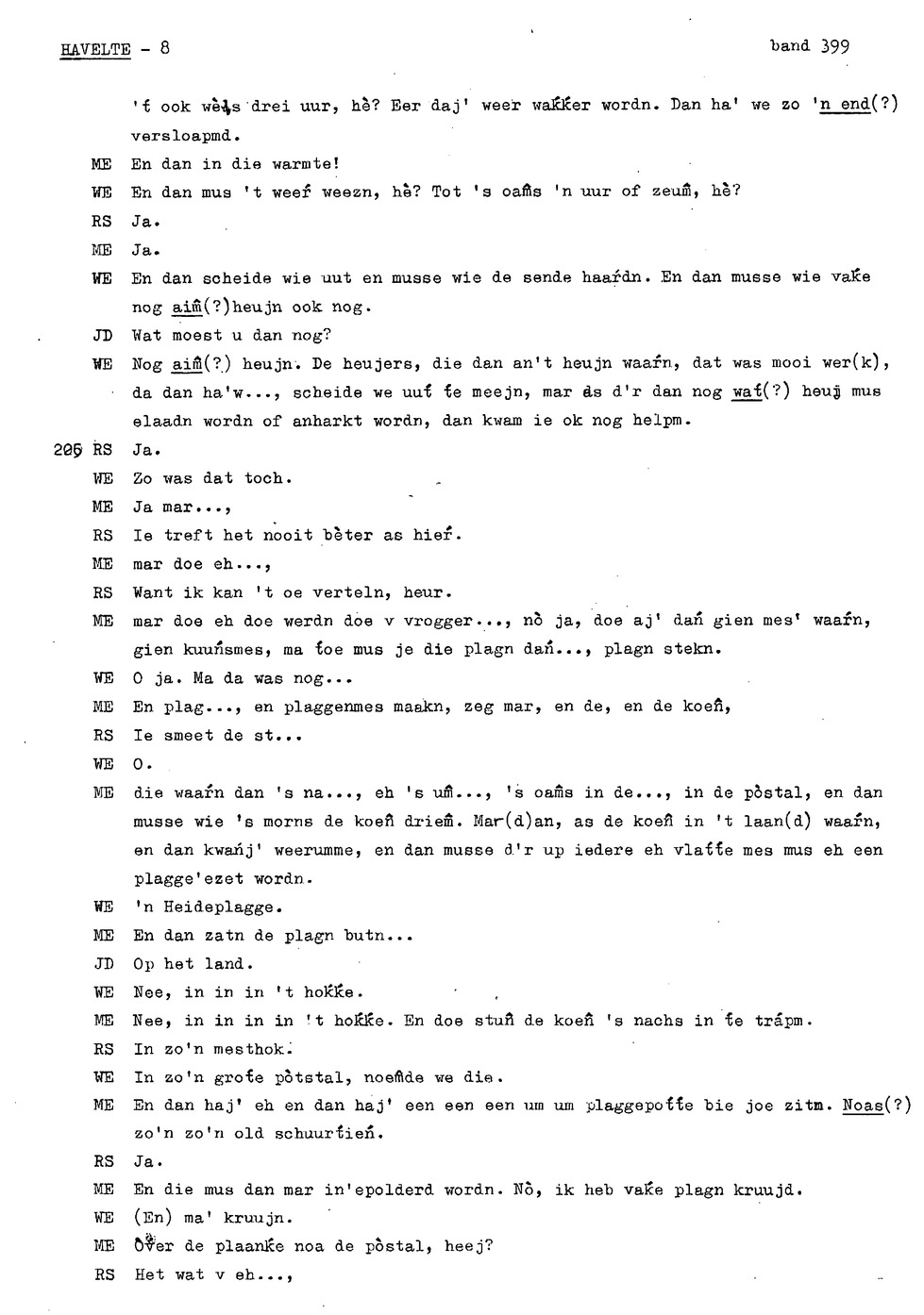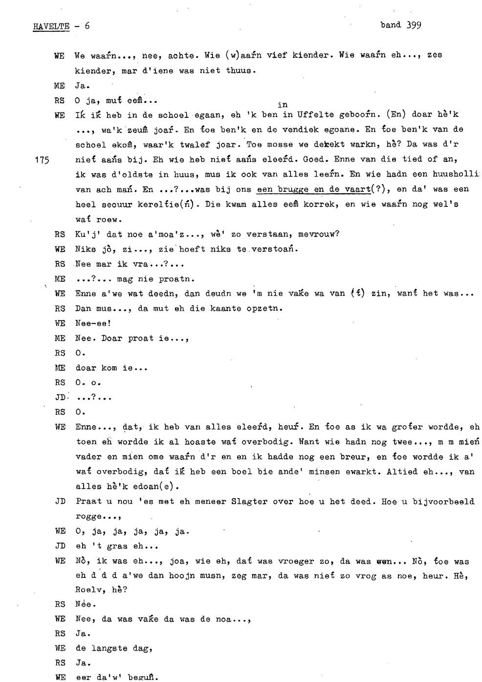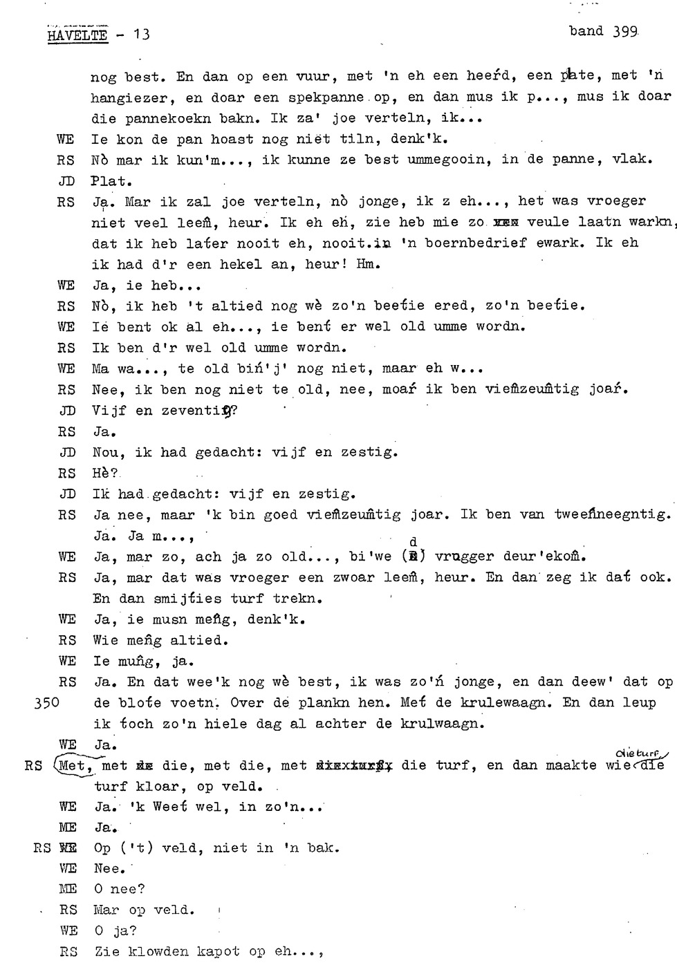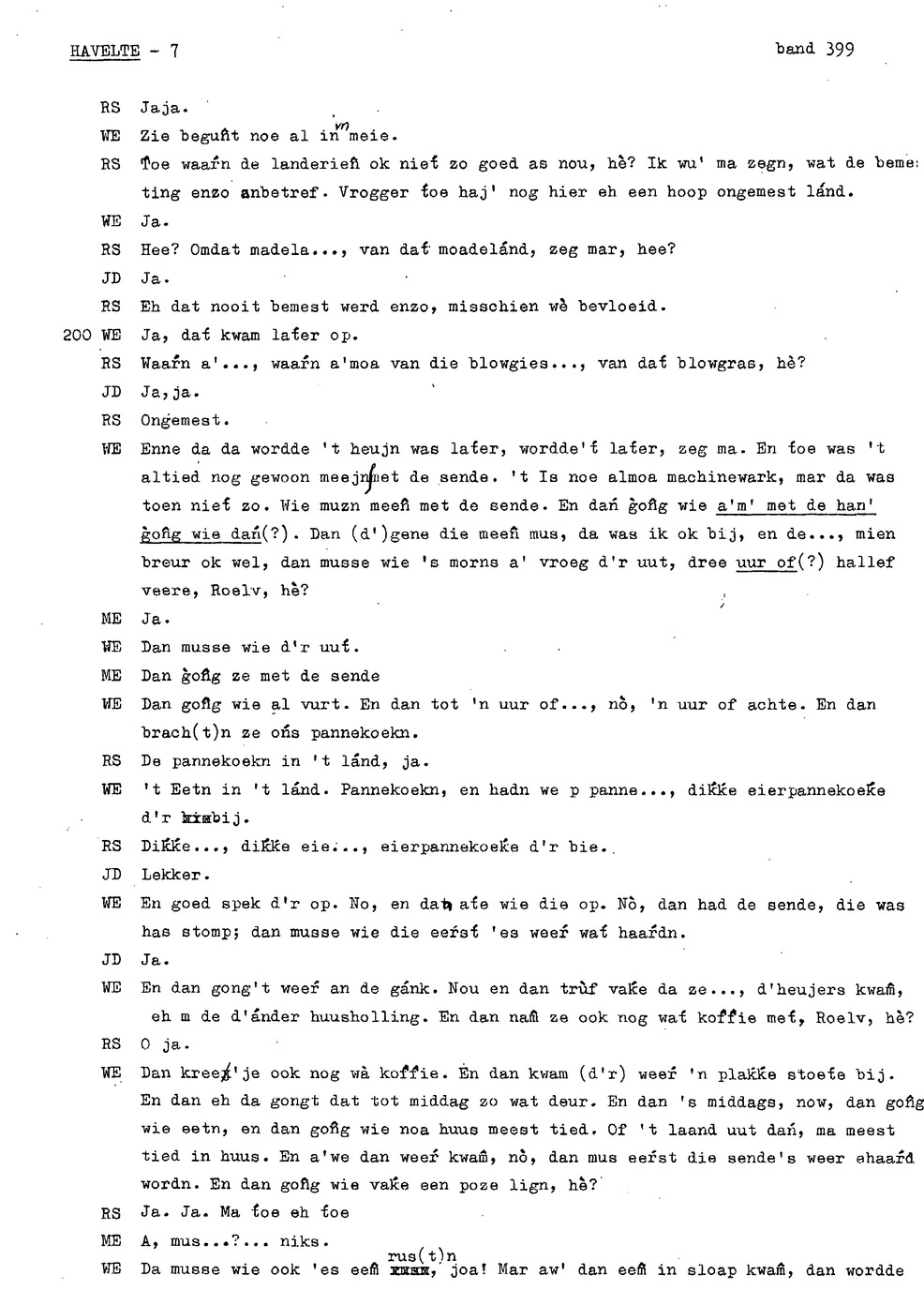 onderwerp: huisslacht; bakken in de oven (‘noamt'); kinderen helpen met koeien op land; eten van opbrengst bedrijf ipv inkopen; over soort toffees (‘kakkeien'); kinderen aten staand bij tafel; personalia: op 12e gaan werken, eerst bij ouders later bij anderen; hooien; handmatig maaien ; verloop werkdag op land; turfwinning; plaggen steken; over karnen met karnmolen; dorsen; pannenkoeken bakken als kind; informant 3 heeft hekel aan boerenbedrijf gekregen; turfwinning; boekweit; ;