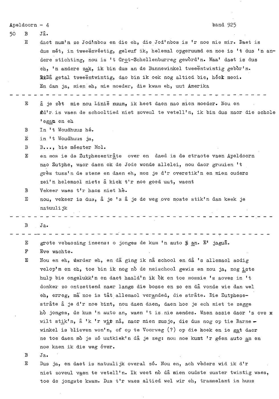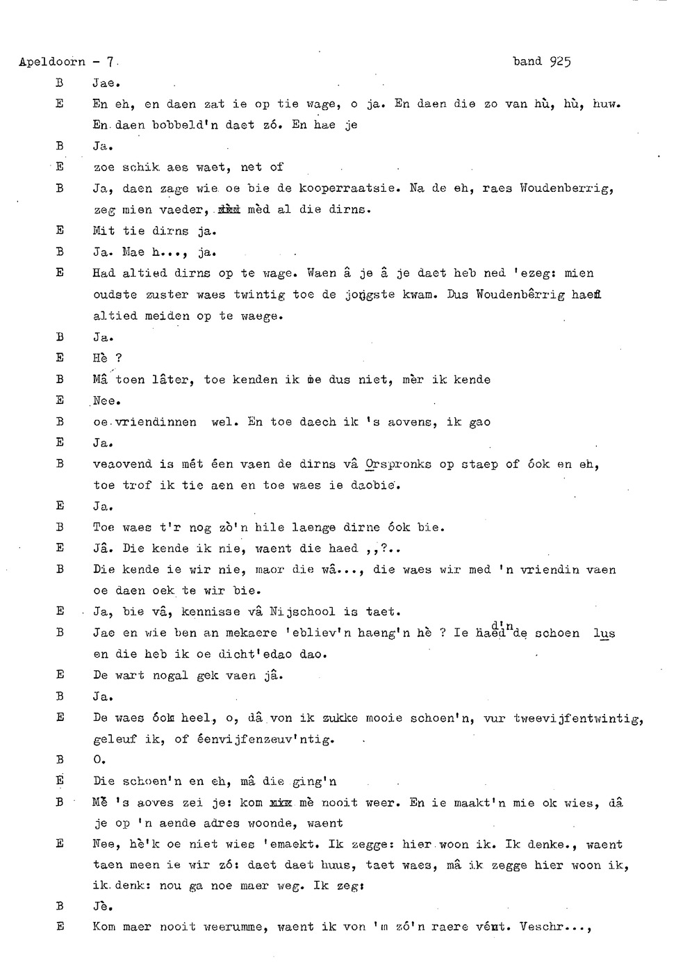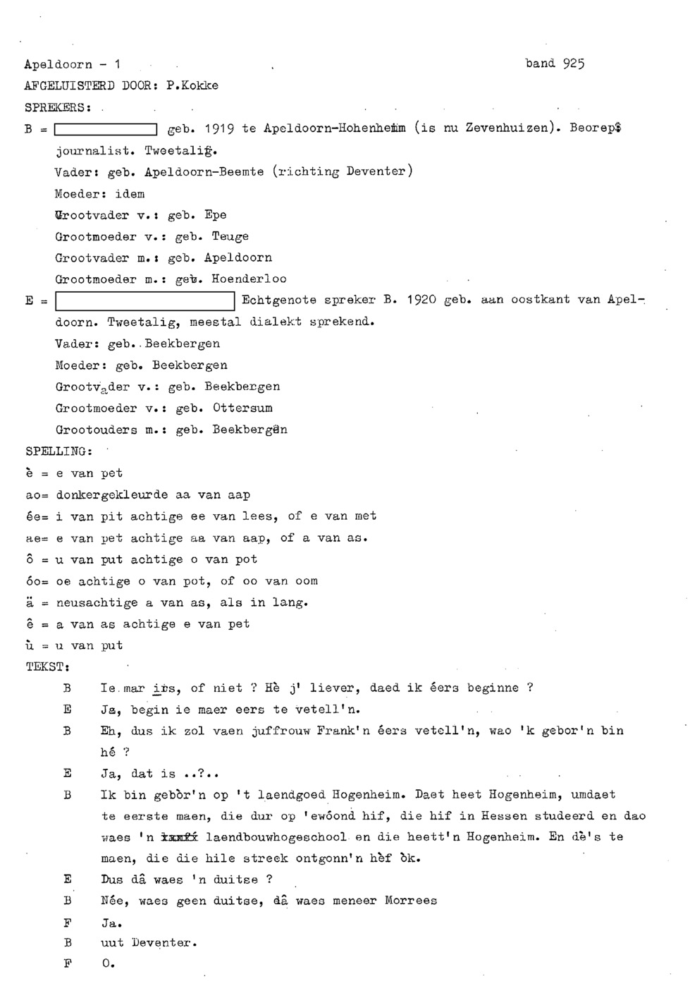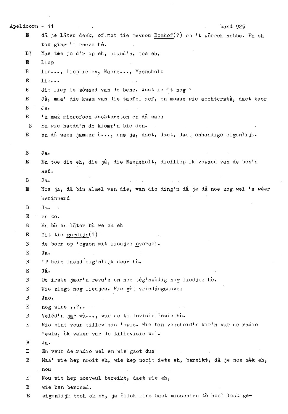 onderwerp: Dhr. en Mw. Bomhof vertellen over hun geboorteplaats, jeugd en schooljaren. Mw. Bomhof vertelt over haar eerste dienst, kennismaking met haar man, verkering, huwelijk, kinderen. ; Liedjes voorgedragen, volksdansen revues schrijven; bij eerste optreden ‘plankenvrees'. Later voor radio en tv opgetreden. ; Dr. bomhof is tweetalig opgegroeid. ; Er is verschil in woorden en in dialect - ook tussen hem en Mw. Bomhof.; Invloed van het Hollands in Apeldoorn