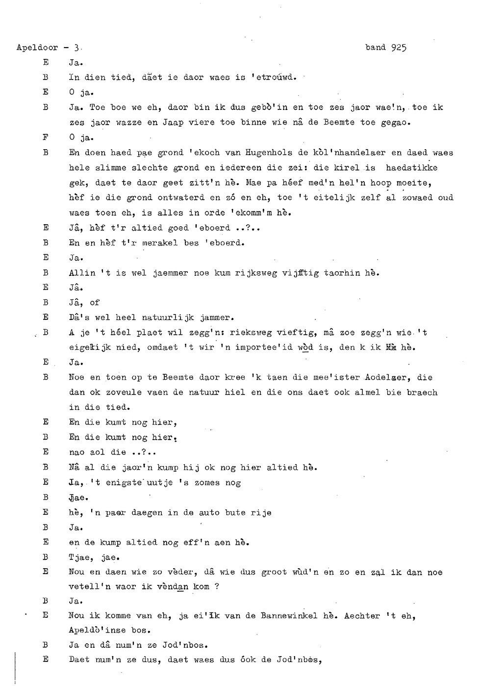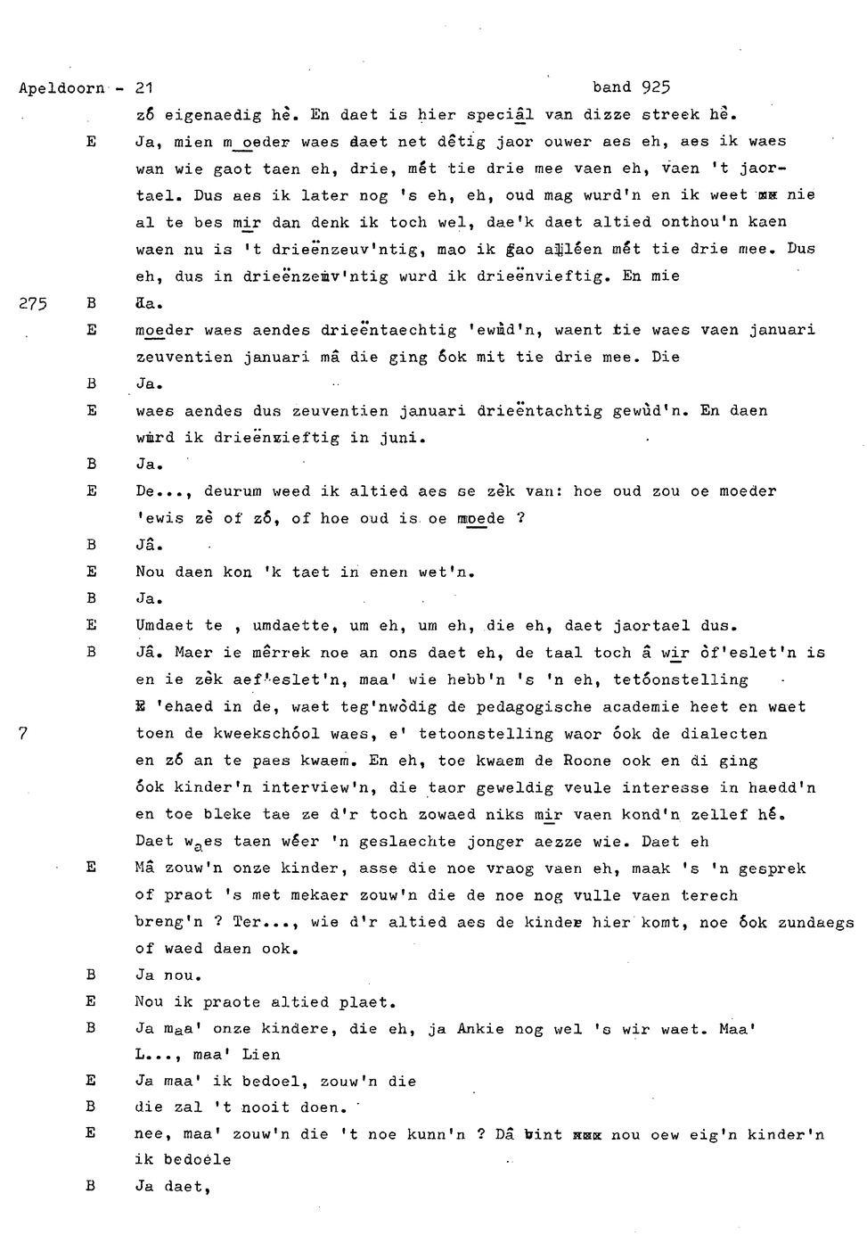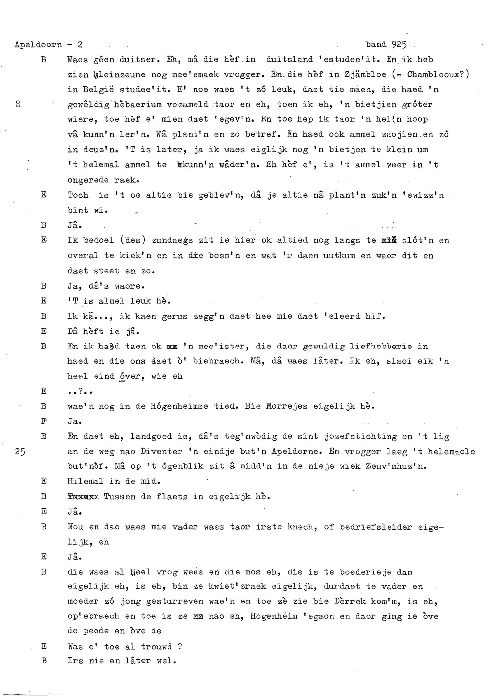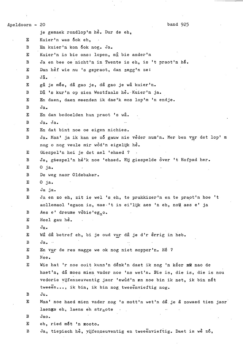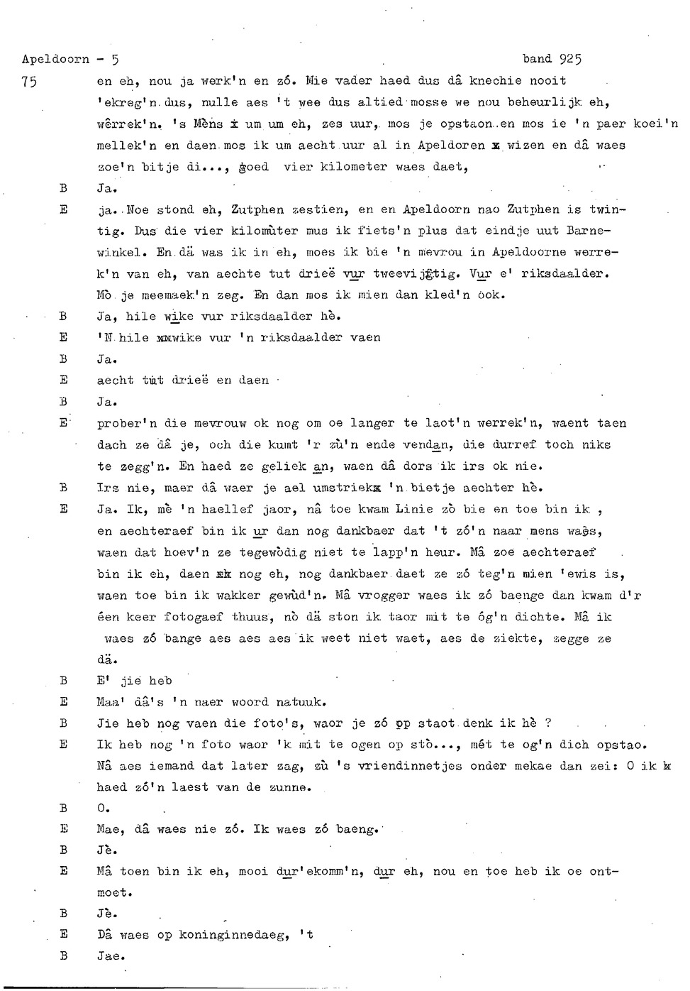 onderwerp: Dhr. en Mw. Bomhof vertellen over hun geboorteplaats, jeugd en schooljaren. Mw. Bomhof vertelt over haar eerste dienst, kennismaking met haar man, verkering, huwelijk, kinderen. ; Liedjes voorgedragen, volksdansen revues schrijven; bij eerste optreden ‘plankenvrees'. Later voor radio en tv opgetreden. ; Dr. bomhof is tweetalig opgegroeid. ; Er is verschil in woorden en in dialect - ook tussen hem en Mw. Bomhof.; Invloed van het Hollands in Apeldoorn