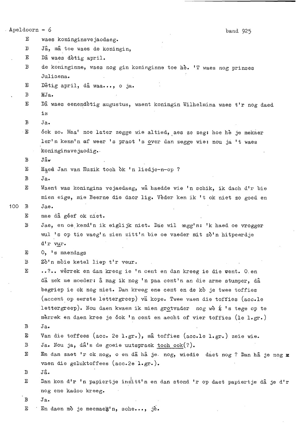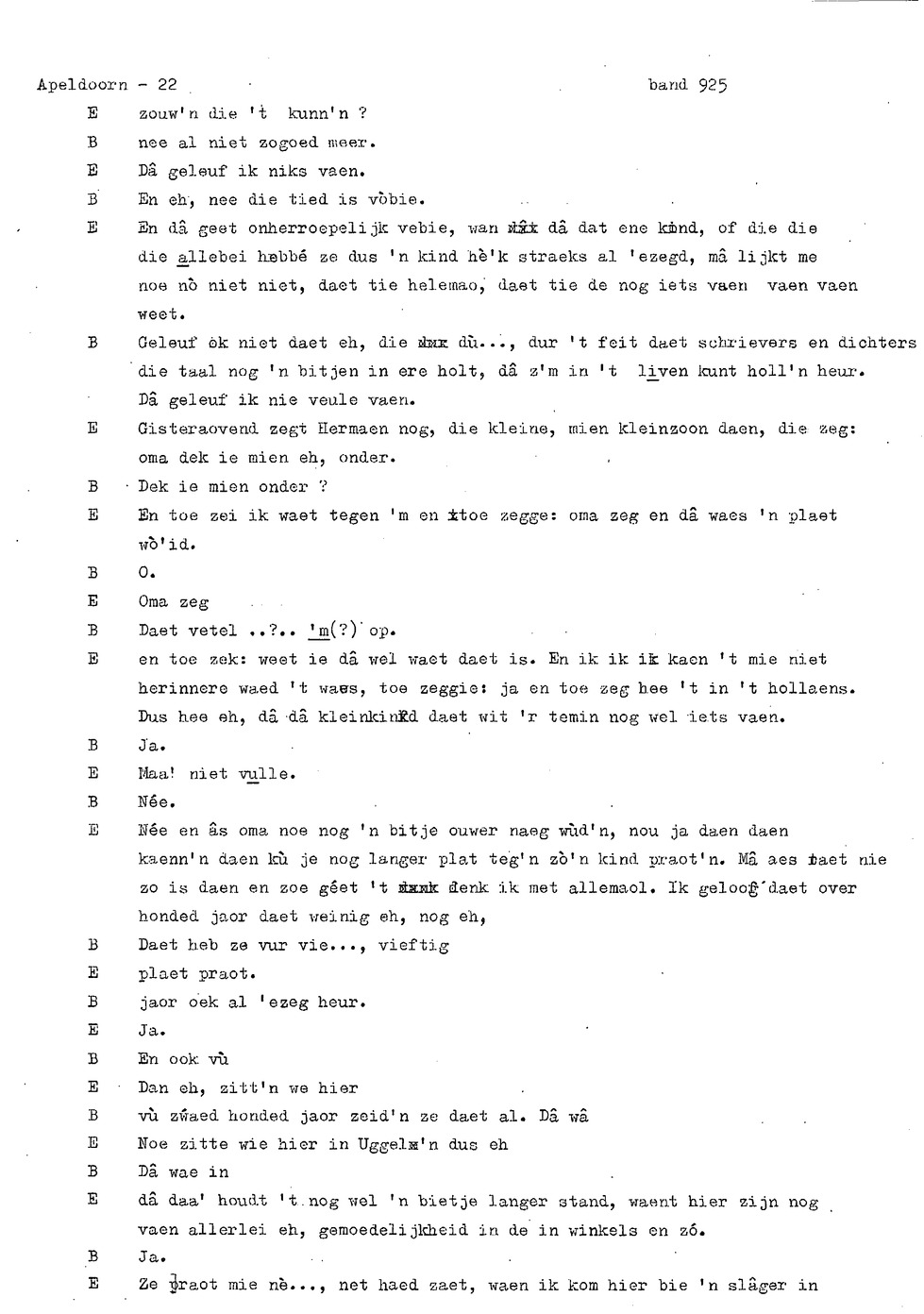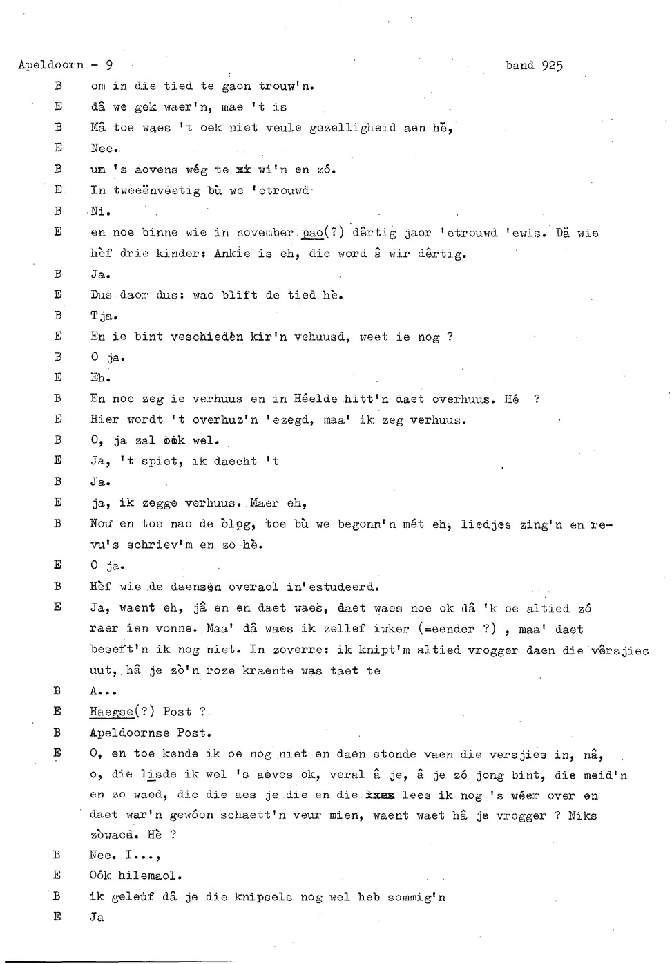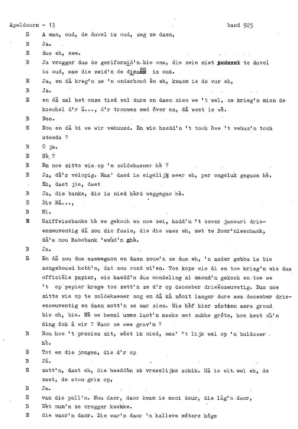 onderwerp: Dhr. en Mw. Bomhof vertellen over hun geboorteplaats, jeugd en schooljaren. Mw. Bomhof vertelt over haar eerste dienst, kennismaking met haar man, verkering, huwelijk, kinderen. ; Liedjes voorgedragen, volksdansen revues schrijven; bij eerste optreden ‘plankenvrees'. Later voor radio en tv opgetreden. ; Dr. bomhof is tweetalig opgegroeid. ; Er is verschil in woorden en in dialect - ook tussen hem en Mw. Bomhof.; Invloed van het Hollands in Apeldoorn
