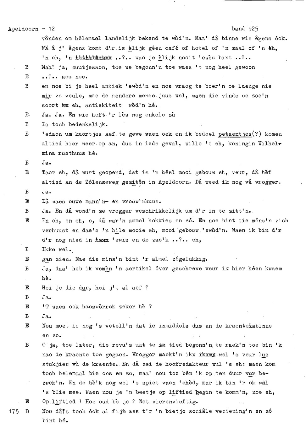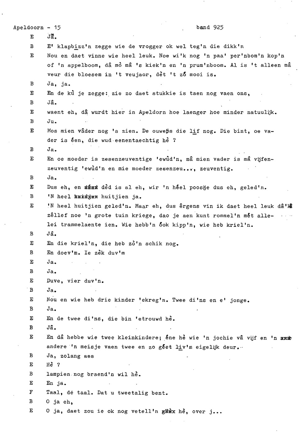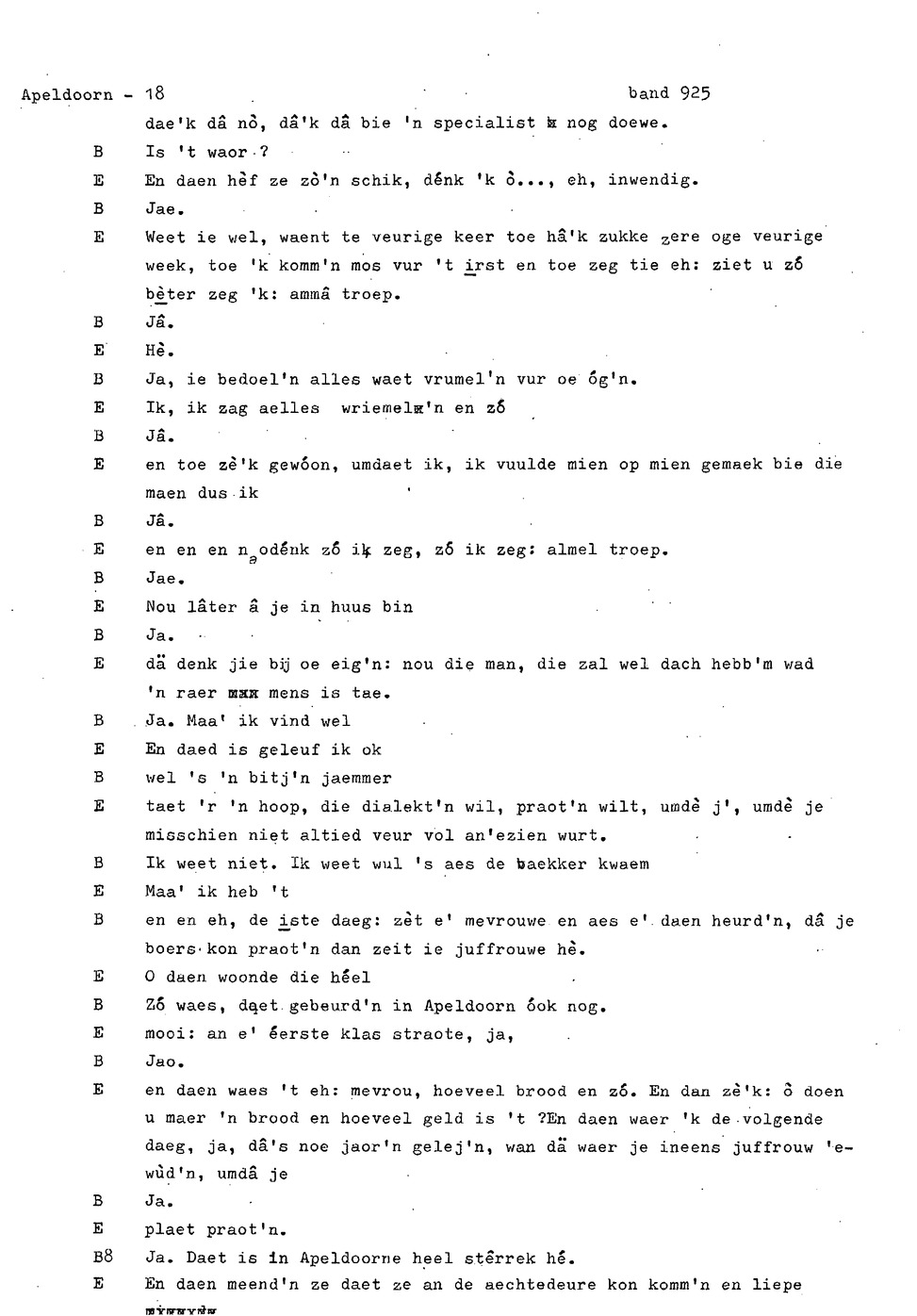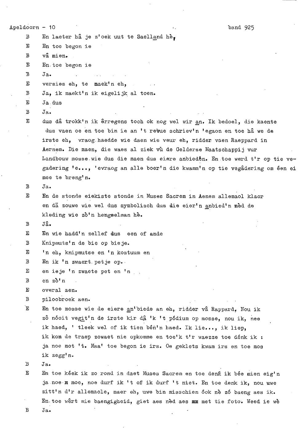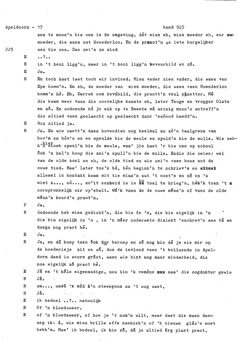 onderwerp: Dhr. en Mw. Bomhof vertellen over hun geboorteplaats, jeugd en schooljaren. Mw. Bomhof vertelt over haar eerste dienst, kennismaking met haar man, verkering, huwelijk, kinderen. ; Liedjes voorgedragen, volksdansen revues schrijven; bij eerste optreden ‘plankenvrees'. Later voor radio en tv opgetreden. ; Dr. bomhof is tweetalig opgegroeid. ; Er is verschil in woorden en in dialect - ook tussen hem en Mw. Bomhof.; Invloed van het Hollands in Apeldoorn