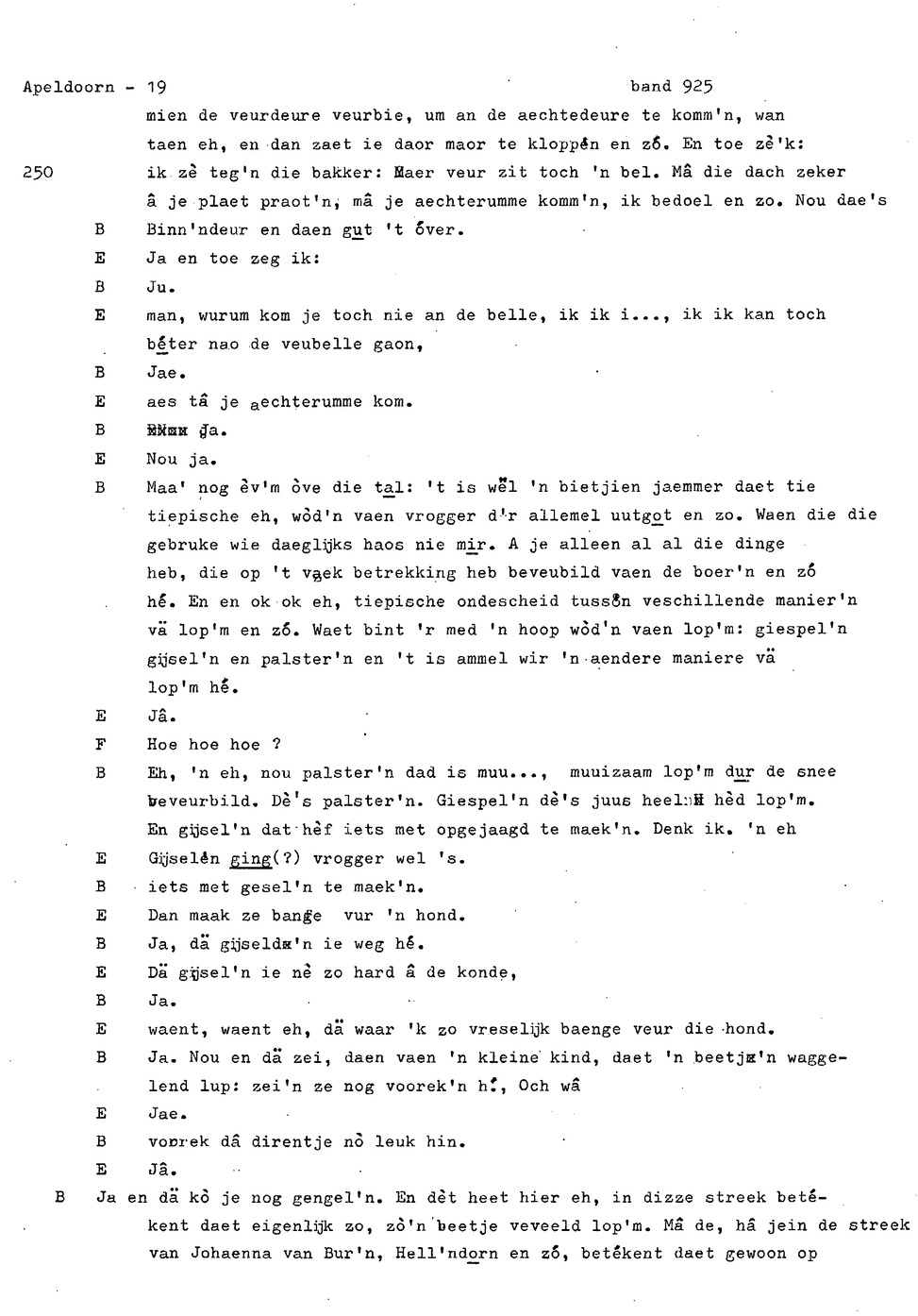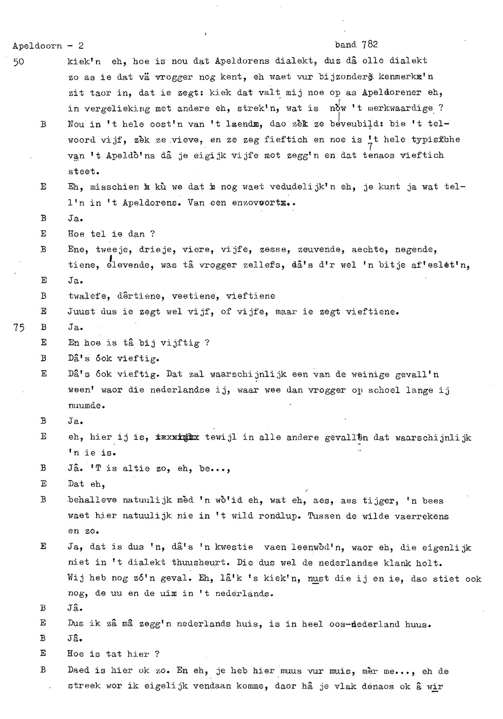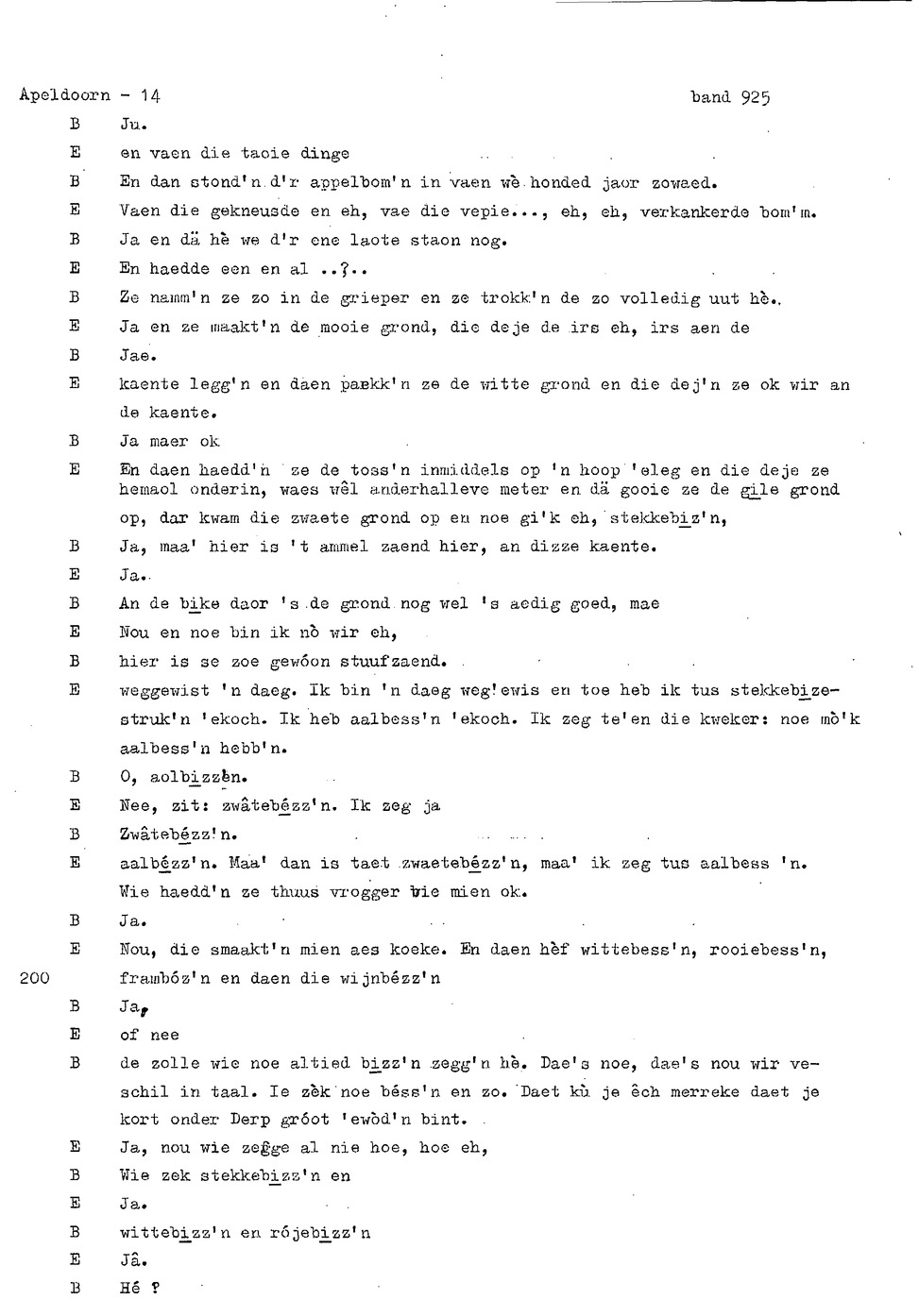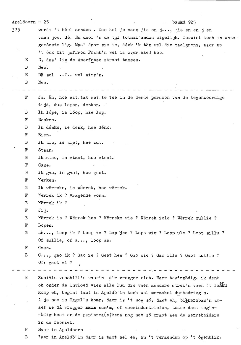 onderwerp: Dhr. en Mw. Bomhof vertellen over hun geboorteplaats, jeugd en schooljaren. Mw. Bomhof vertelt over haar eerste dienst, kennismaking met haar man, verkering, huwelijk, kinderen. ; Liedjes voorgedragen, volksdansen revues schrijven; bij eerste optreden ‘plankenvrees'. Later voor radio en tv opgetreden. ; Dr. bomhof is tweetalig opgegroeid. ; Er is verschil in woorden en in dialect - ook tussen hem en Mw. Bomhof.; Invloed van het Hollands in Apeldoorn