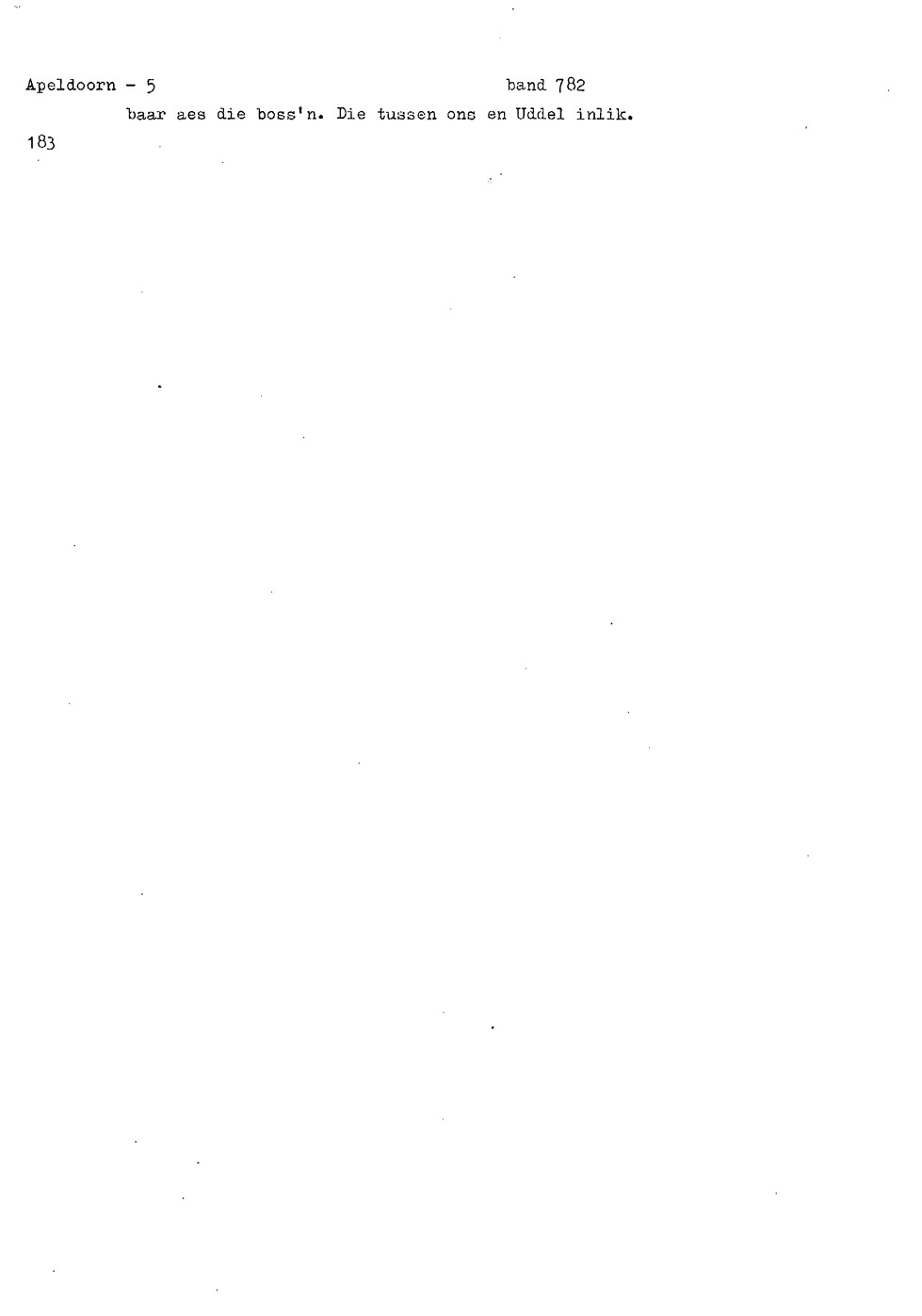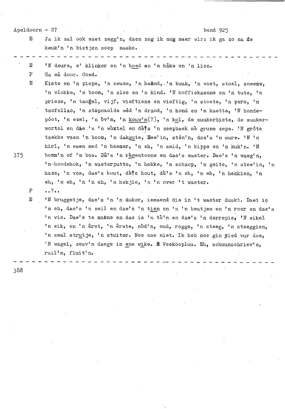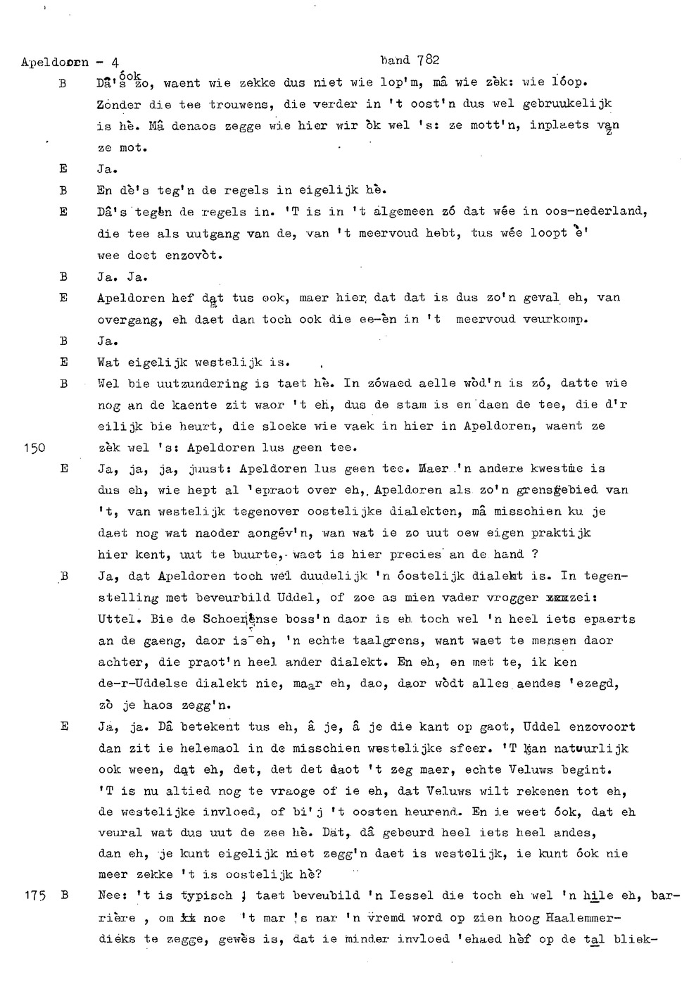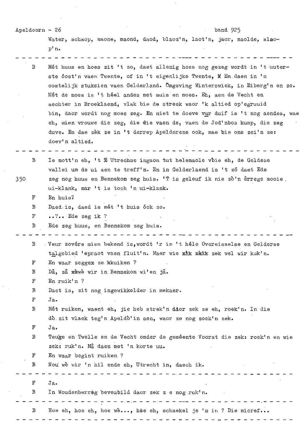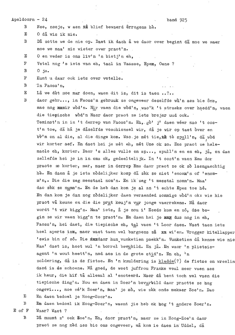 onderwerp: Dhr. en Mw. Bomhof vertellen over hun geboorteplaats, jeugd en schooljaren. Mw. Bomhof vertelt over haar eerste dienst, kennismaking met haar man, verkering, huwelijk, kinderen. ; Liedjes voorgedragen, volksdansen revues schrijven; bij eerste optreden ‘plankenvrees'. Later voor radio en tv opgetreden. ; Dr. bomhof is tweetalig opgegroeid. ; Er is verschil in woorden en in dialect - ook tussen hem en Mw. Bomhof.; Invloed van het Hollands in Apeldoorn