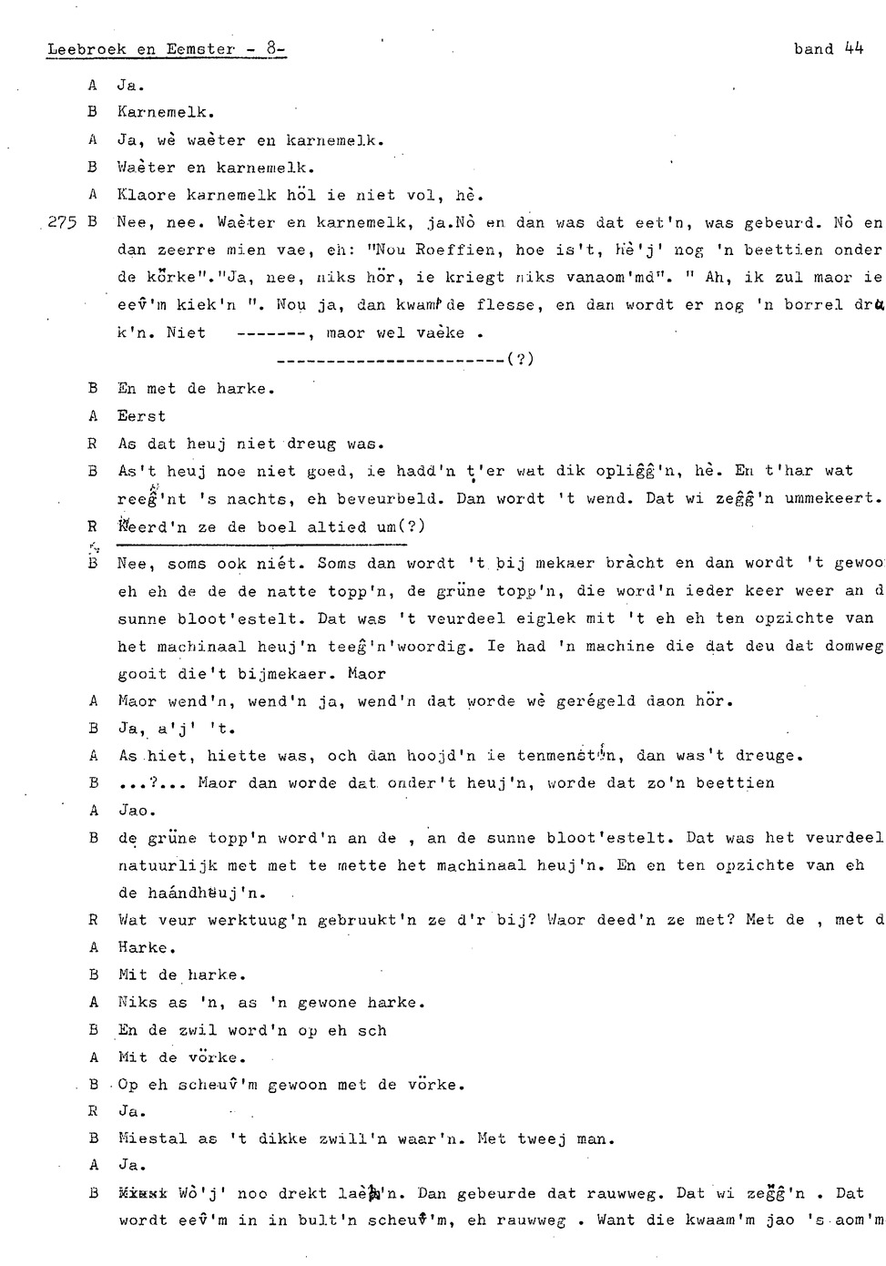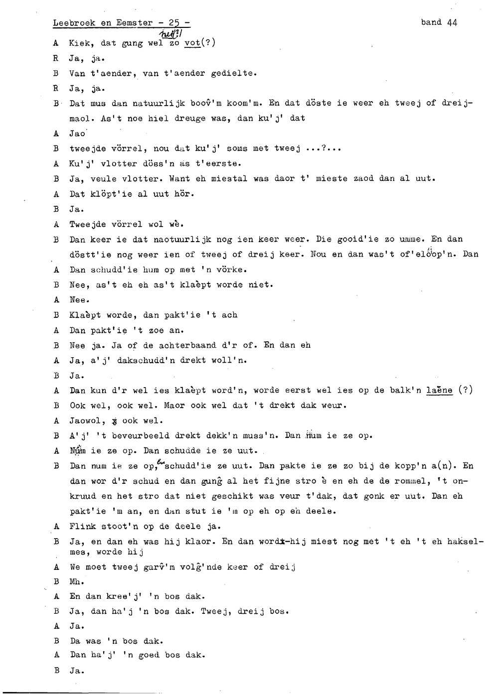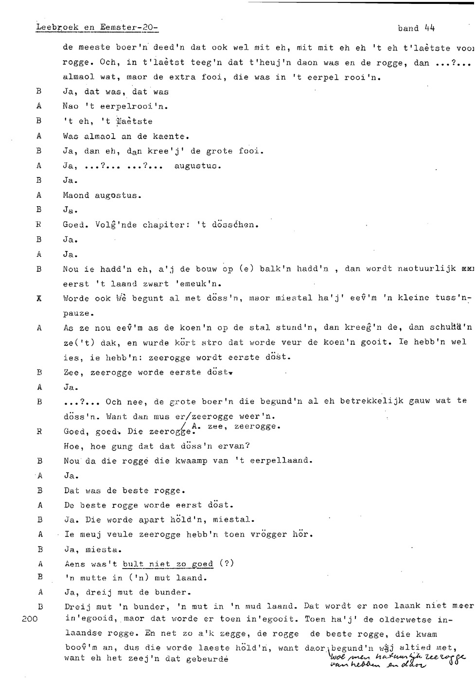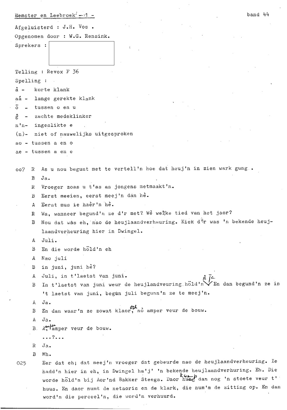 onderwerp: vervolg cd M.0043.1; leggen van hooi moeilijker dan van rogge; inhalen van rogge en haver; rogge thuis op balken leggen was vakwerk; hele roggebouw kwam op de balken; was de bouw binnen,dan balken scheren; zaaien rond 23 september voor de Dwingeldermarkt; op en onder de zesse (tussen 6 uur ‘s ochtends en 6 uur ‘s avonds) ; aardappeloogst voor Roldermarkt 2e maandag in oktober; over het dorsen, zaairogge werd als eerste gedorst; hoeveel garven een legge was, hing van breedte van de deel af; Dakstro werd ‘gekleept' , was niet het grofste en niet het fijnste stro; dorsen ging met maximaal vier man; techniek van het slaan van de rogge (over de schouder); met de ‘wande' of ‘wiende' werd de rogge schoongemaakt; dorsen na regen moeilijker dan na droog weer; eerste rogge voor het vetmesten van het varken; dorsen ging met de rosmolen (met een paard) bij grotere boeren; gebruik van handkrachtmachine
