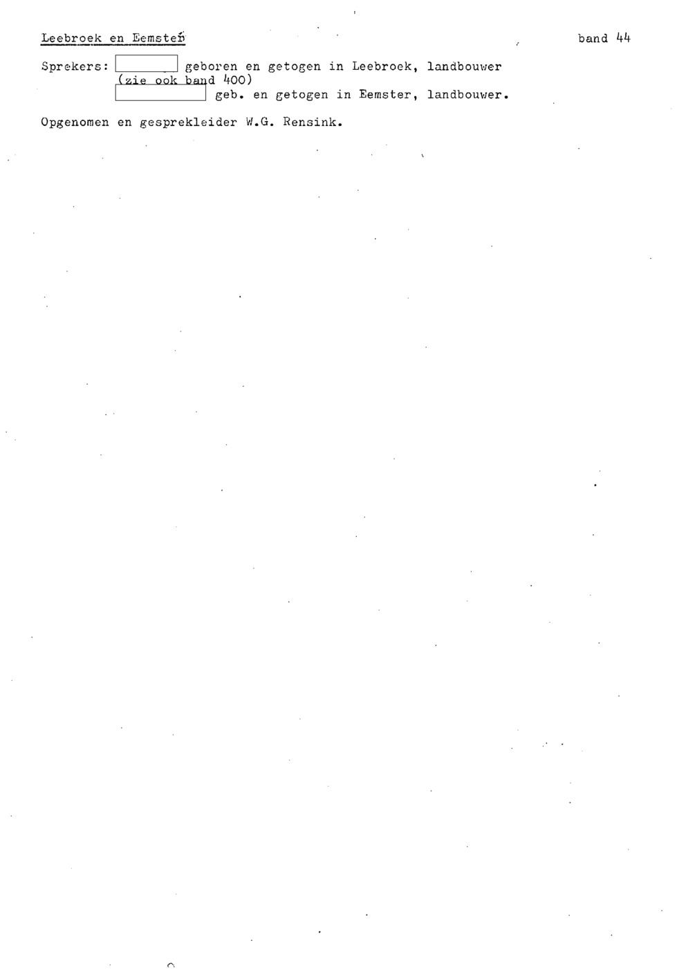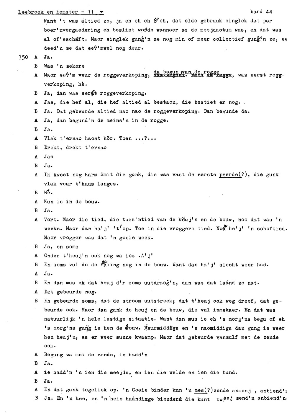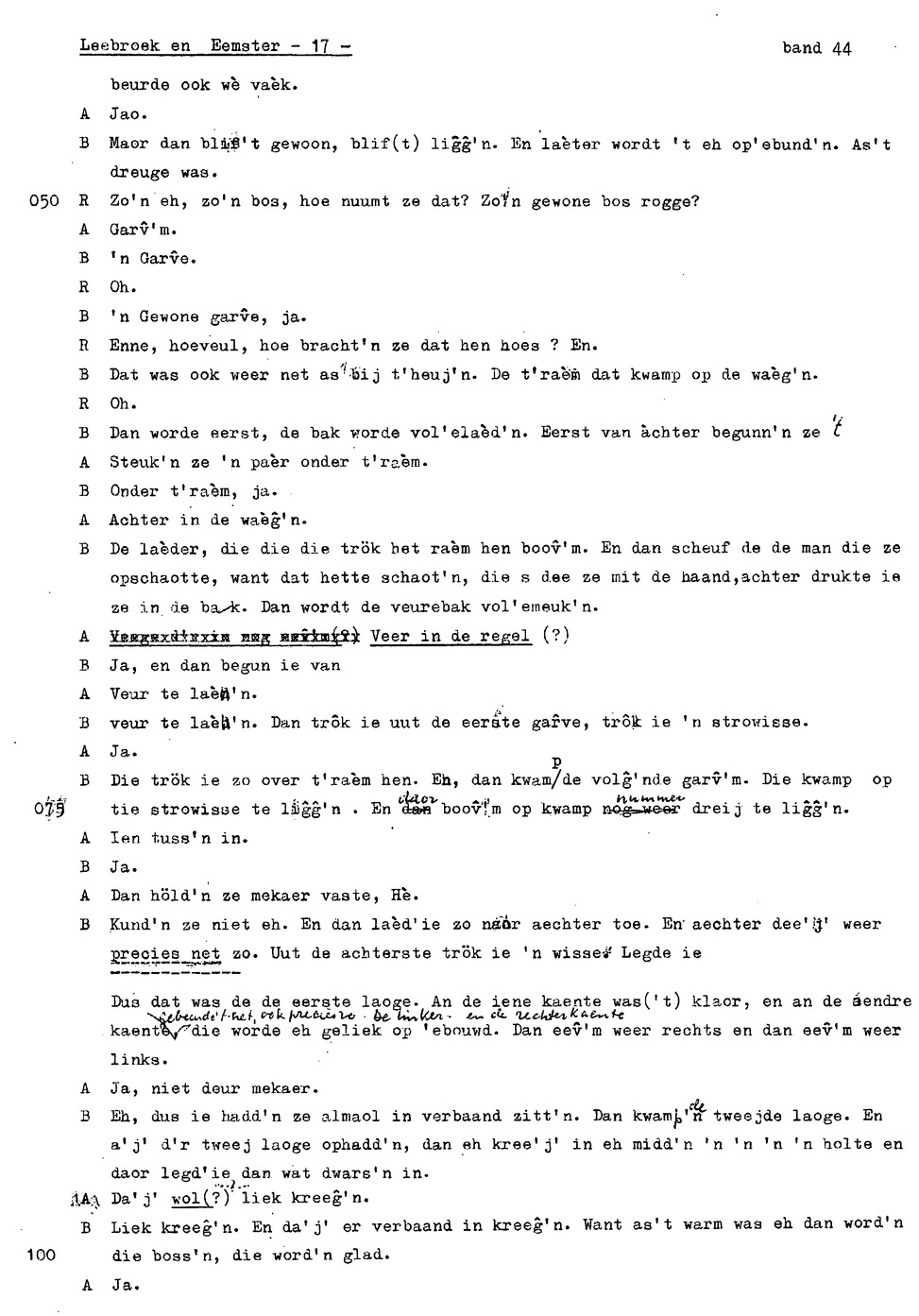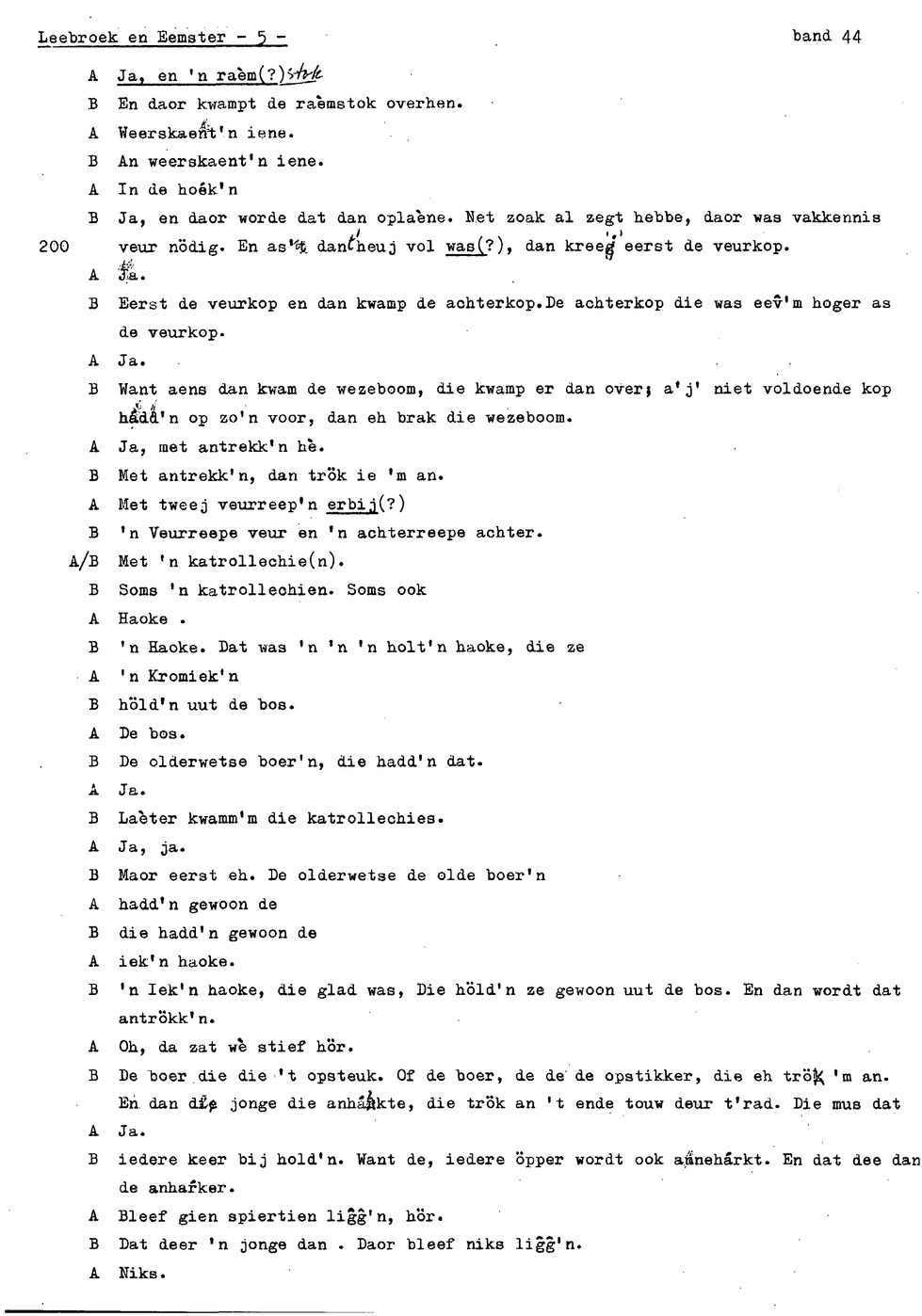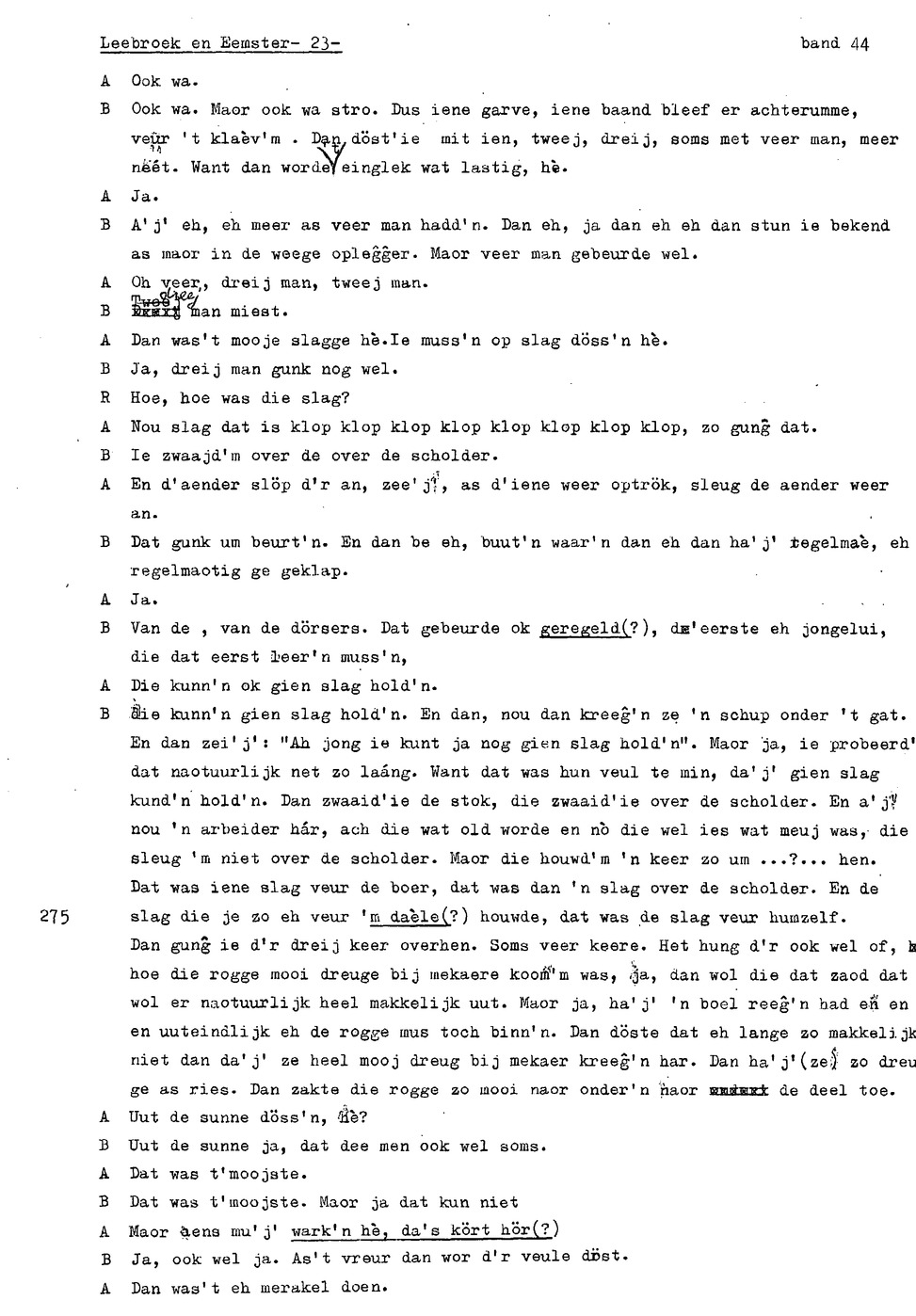 onderwerp: vervolg cd M.0043.1; leggen van hooi moeilijker dan van rogge; inhalen van rogge en haver; rogge thuis op balken leggen was vakwerk; hele roggebouw kwam op de balken; was de bouw binnen,dan balken scheren; zaaien rond 23 september voor de Dwingeldermarkt; op en onder de zesse (tussen 6 uur ‘s ochtends en 6 uur ‘s avonds) ; aardappeloogst voor Roldermarkt 2e maandag in oktober; over het dorsen, zaairogge werd als eerste gedorst; hoeveel garven een legge was, hing van breedte van de deel af; Dakstro werd ‘gekleept' , was niet het grofste en niet het fijnste stro; dorsen ging met maximaal vier man; techniek van het slaan van de rogge (over de schouder); met de ‘wande' of ‘wiende' werd de rogge schoongemaakt; dorsen na regen moeilijker dan na droog weer; eerste rogge voor het vetmesten van het varken; dorsen ging met de rosmolen (met een paard) bij grotere boeren; gebruik van handkrachtmachine