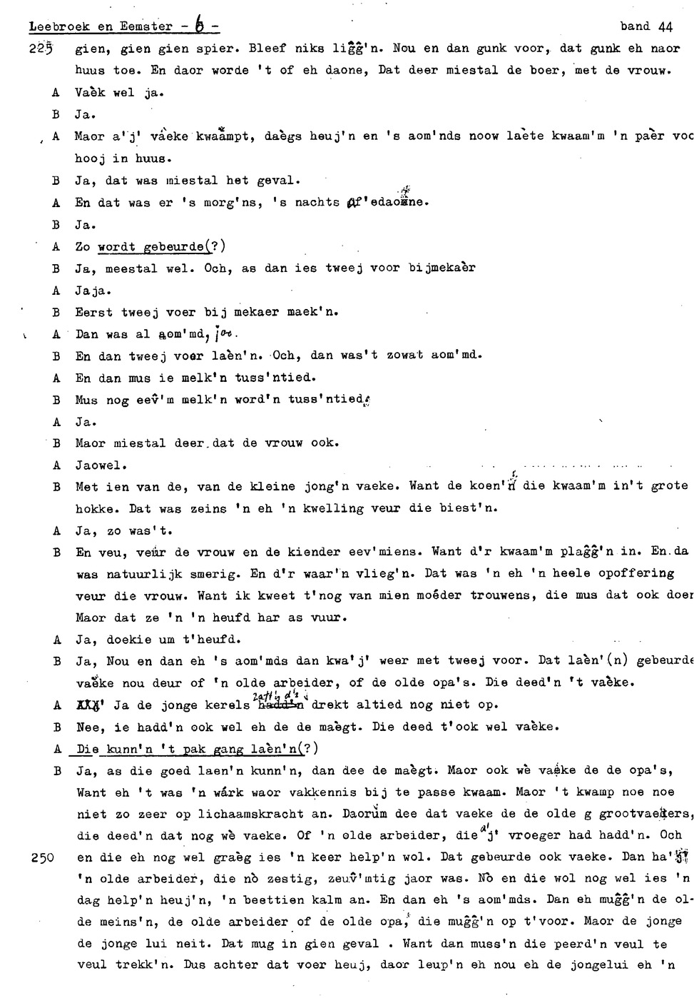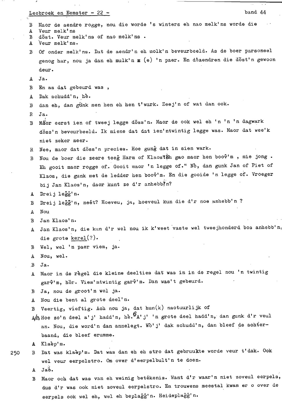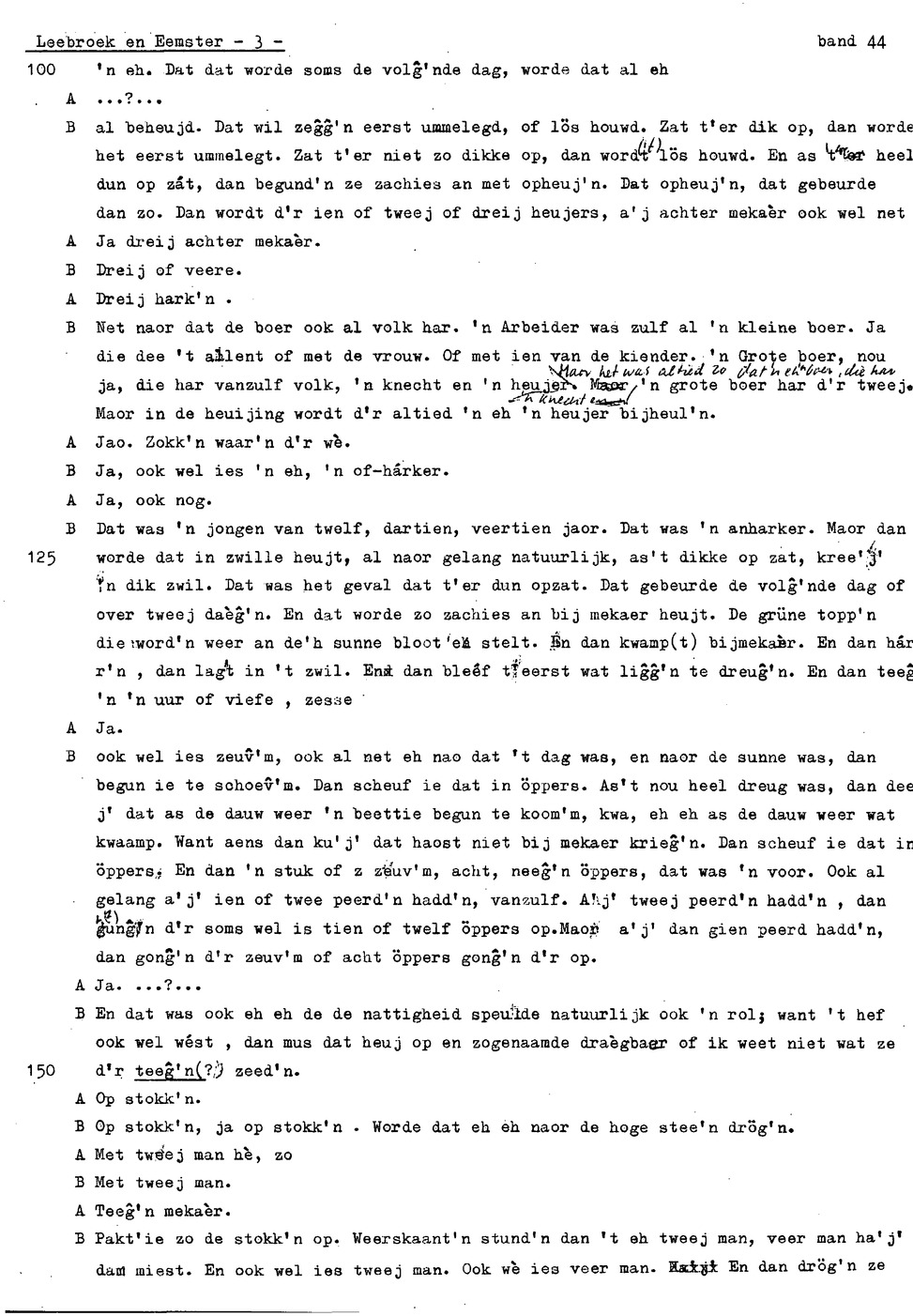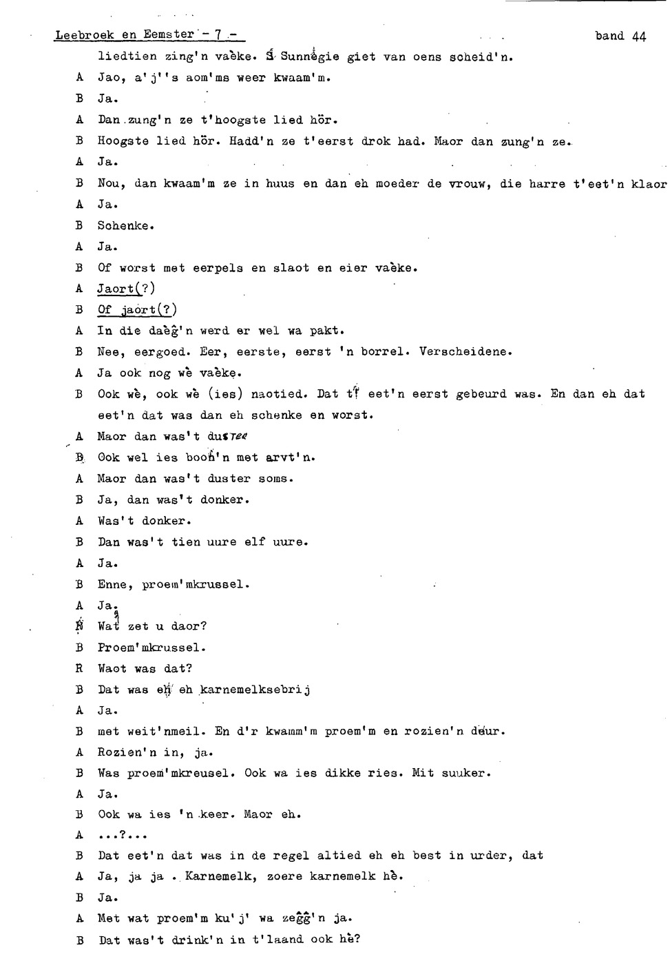 onderwerp: vervolg cd M.0043.1; leggen van hooi moeilijker dan van rogge; inhalen van rogge en haver; rogge thuis op balken leggen was vakwerk; hele roggebouw kwam op de balken; was de bouw binnen,dan balken scheren; zaaien rond 23 september voor de Dwingeldermarkt; op en onder de zesse (tussen 6 uur ‘s ochtends en 6 uur ‘s avonds) ; aardappeloogst voor Roldermarkt 2e maandag in oktober; over het dorsen, zaairogge werd als eerste gedorst; hoeveel garven een legge was, hing van breedte van de deel af; Dakstro werd ‘gekleept' , was niet het grofste en niet het fijnste stro; dorsen ging met maximaal vier man; techniek van het slaan van de rogge (over de schouder); met de ‘wande' of ‘wiende' werd de rogge schoongemaakt; dorsen na regen moeilijker dan na droog weer; eerste rogge voor het vetmesten van het varken; dorsen ging met de rosmolen (met een paard) bij grotere boeren; gebruik van handkrachtmachine