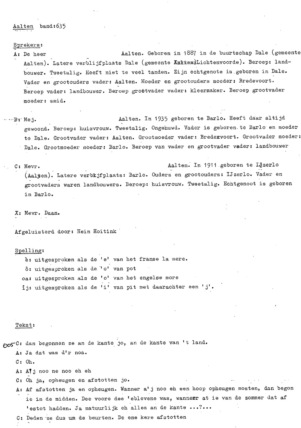 opname 4 (01:03:29) Voordrachten Sprekers uit: Dingsperlo, Dinxperlo Varsseveld, Varseveld? Suderwick (Duitsland) Winterswijk Silvolde Aalten Lintelo Vorden Westendorp IJzerlo Heelweg uit de "Achterhoek" Spoor 2 CD1: